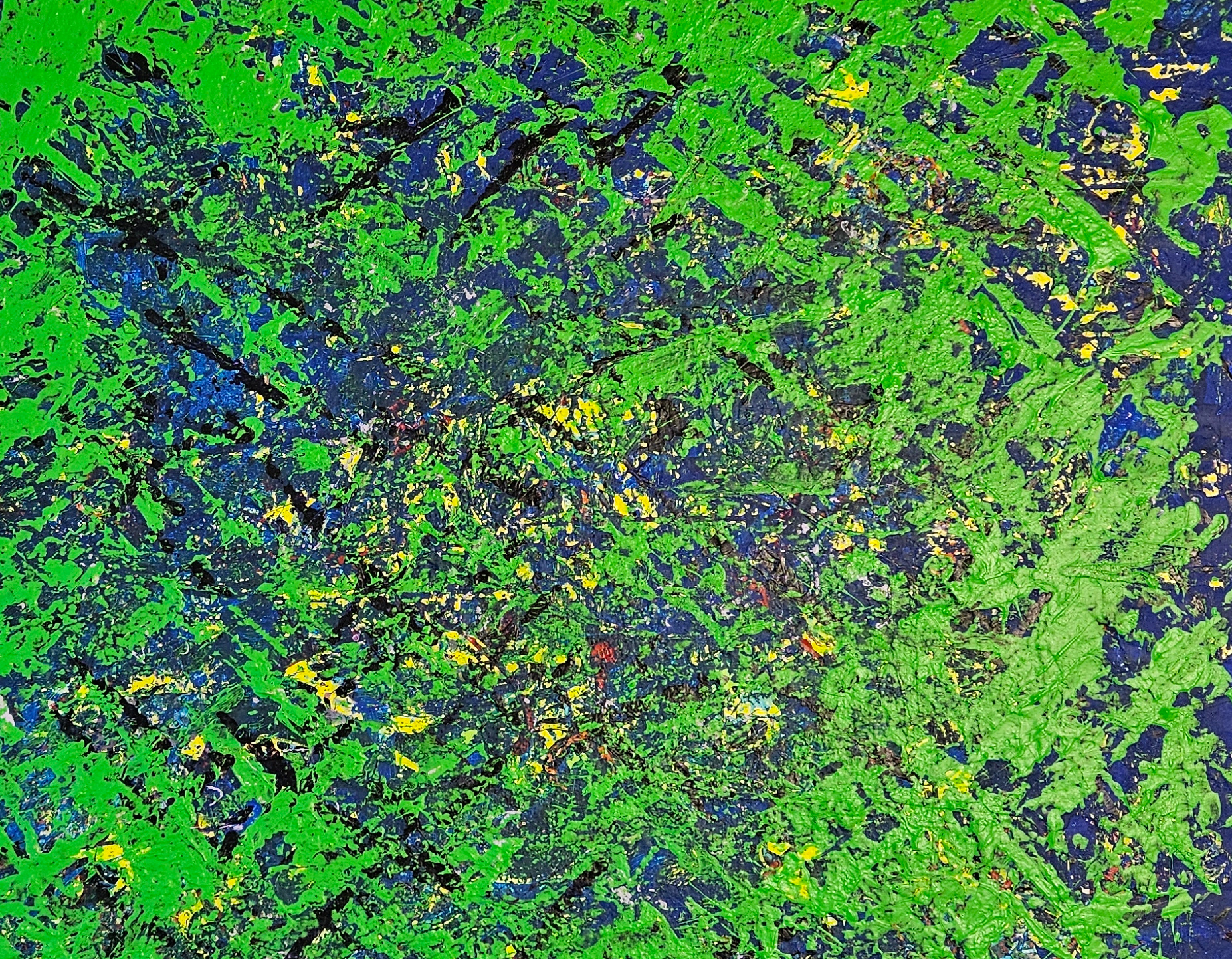 This painting by the french Artist Guillaume Marchat symbolizes the Big Bang, the creation of the universe, of light, of time, and of life, 13.7 billion years ago. The primordial explosion is represented here by a thick layer of paint in various colors at the center, containing all the matter of our universe concentrated in a tiny volume. The predominant green in the central area seems to burst outward against the blue background.