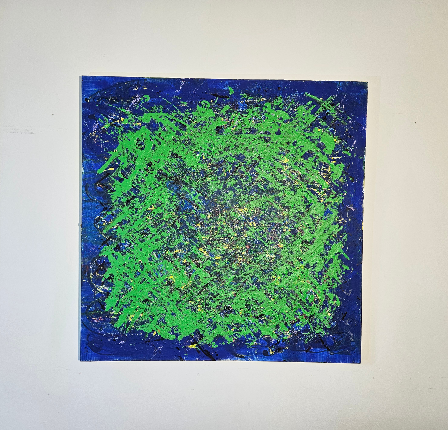 Abstract green Big Bang on blue background, acrylic on canvas, 100×100 cm