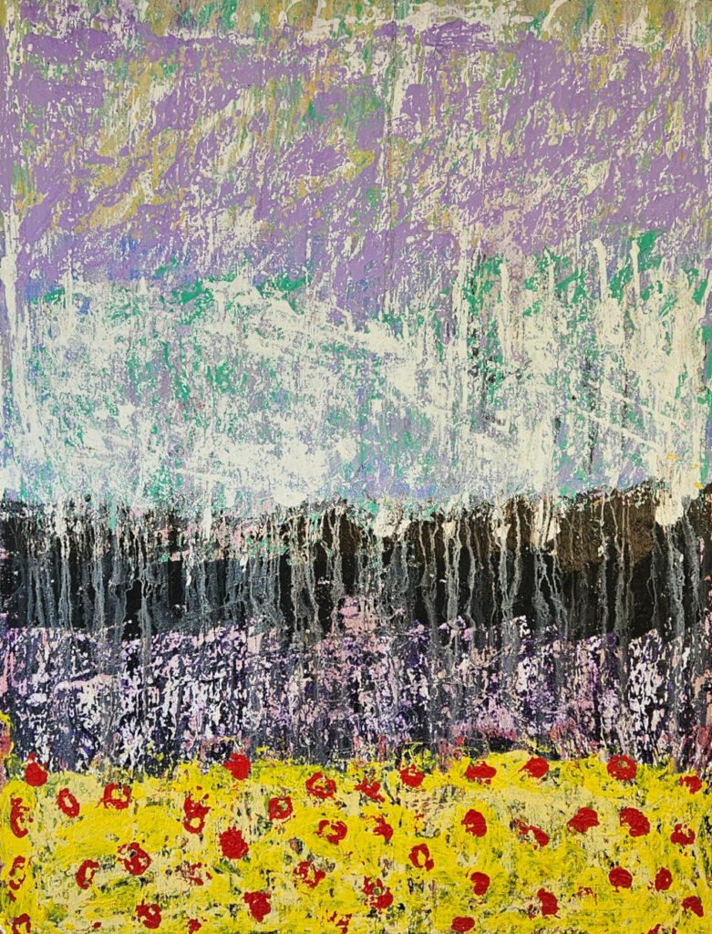 Contemporary abstractartwork, painting by the French artist Guillaume Marchat. Landscape with a red sky, black mountains, and a purple sea. The strokes suggest the warmth of the sunset.
