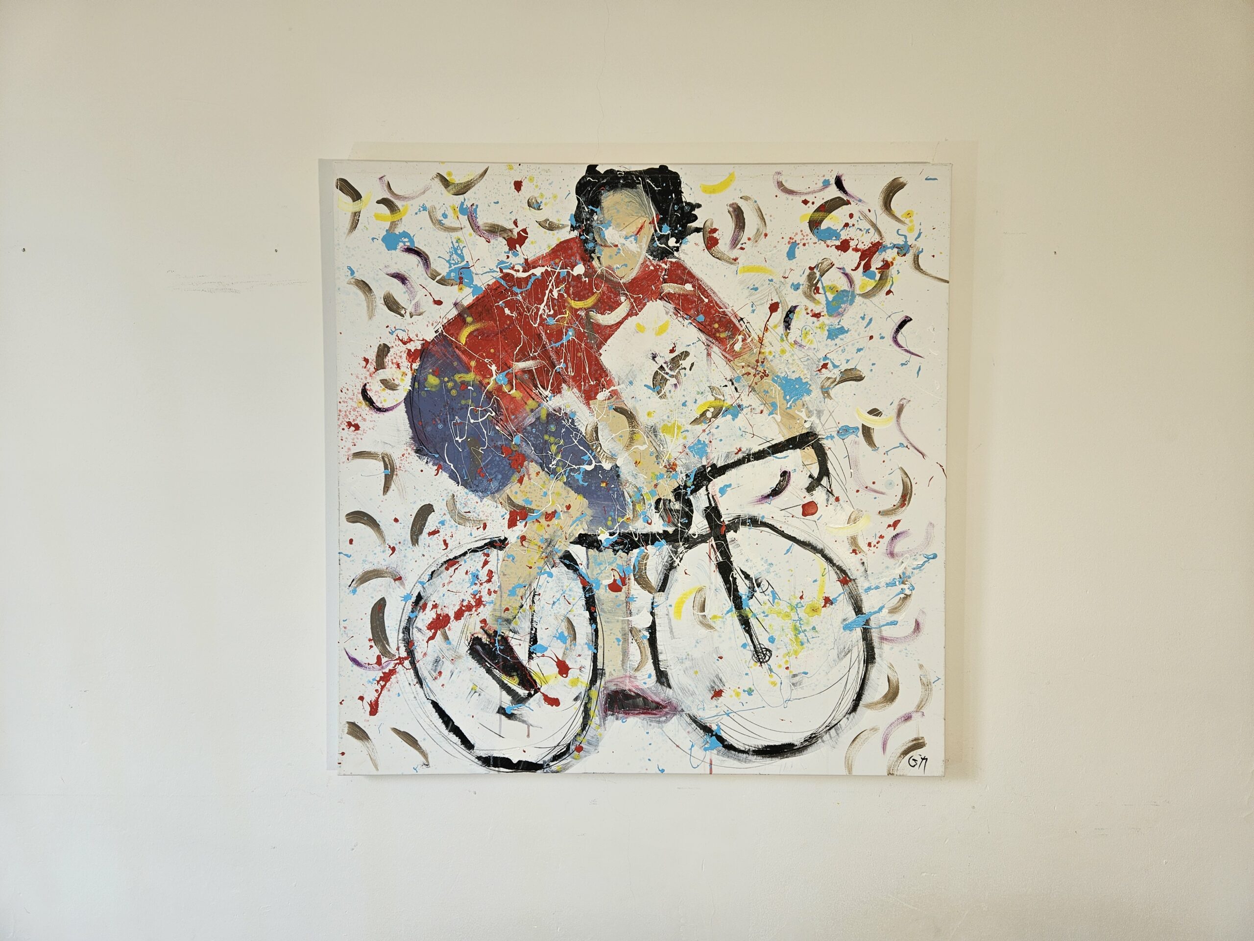 Contemporary minimalist painting by the french artist Guillaume Marchat, depicting a cyclist in a red jersey. The paint splashes create a sense of movement and speed.