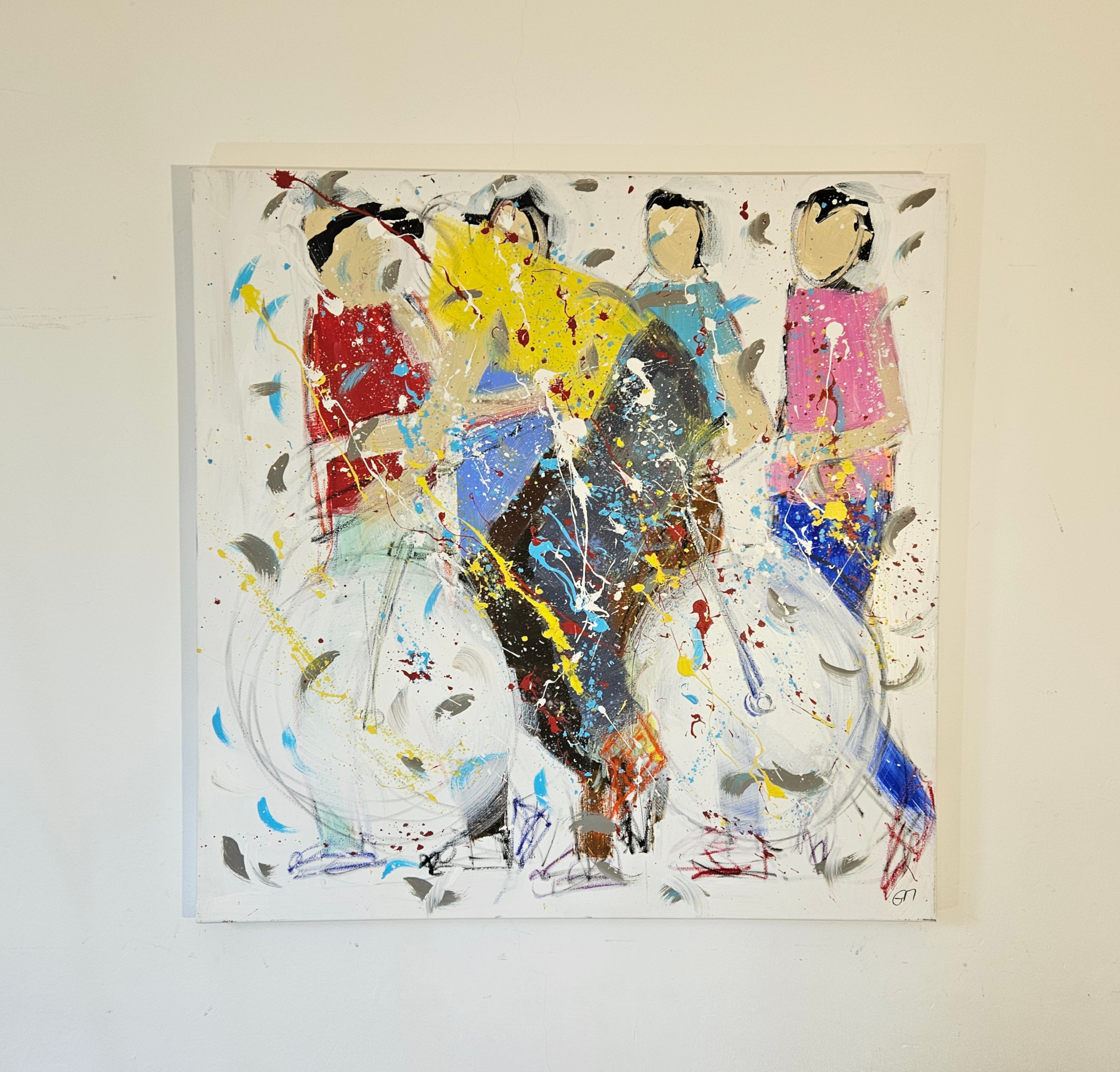 Contemporary minimalist painting by the French artist Guillaume Marchat, depicting a cyclist in a yellow jersey. The paint splashes create a sense of movement and speed.