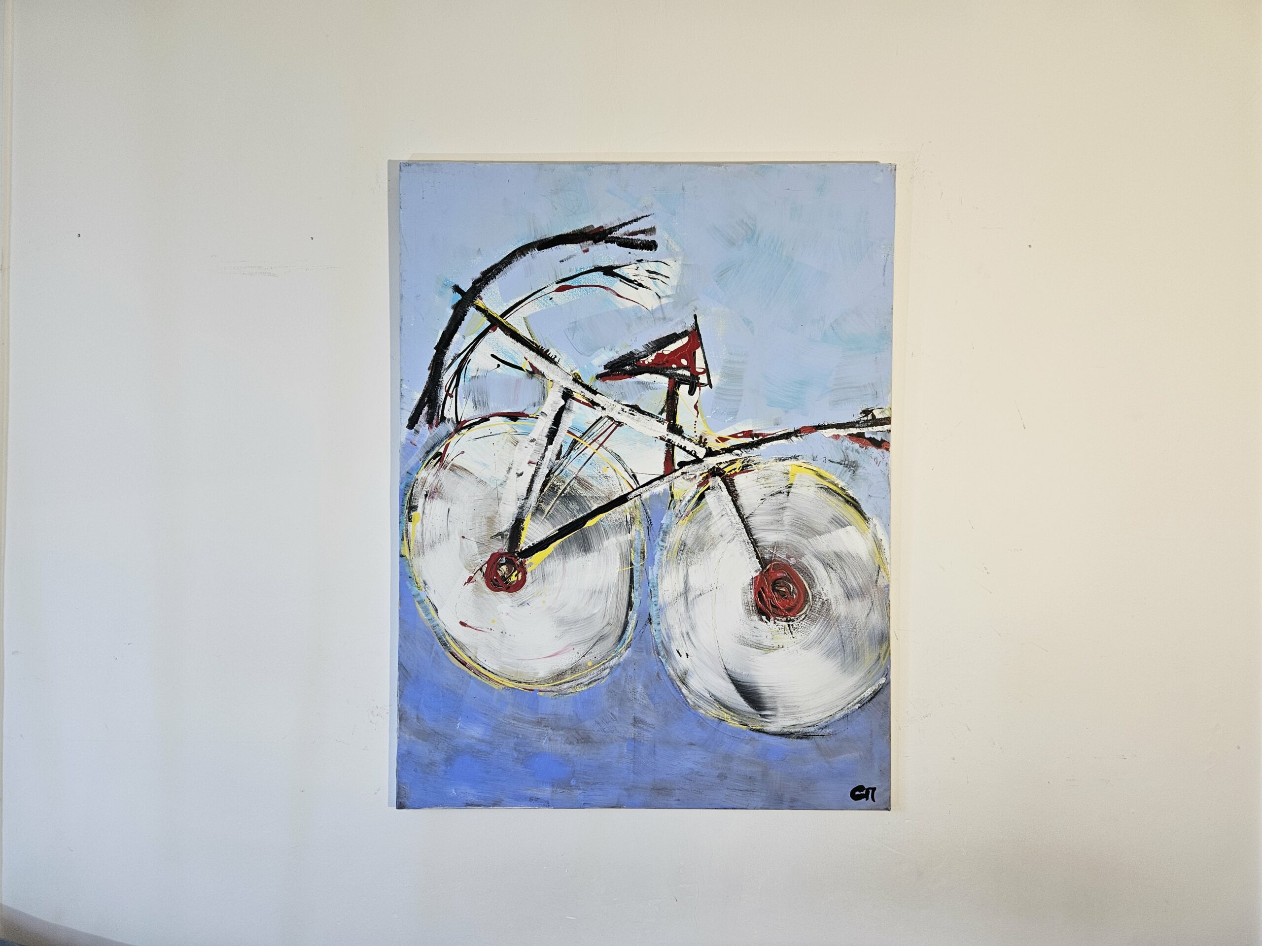 Contemporary minimalist painting by the french artist uillaume Marchat, depicting a naïve-style painting of a black and red bicycle on a blue background.