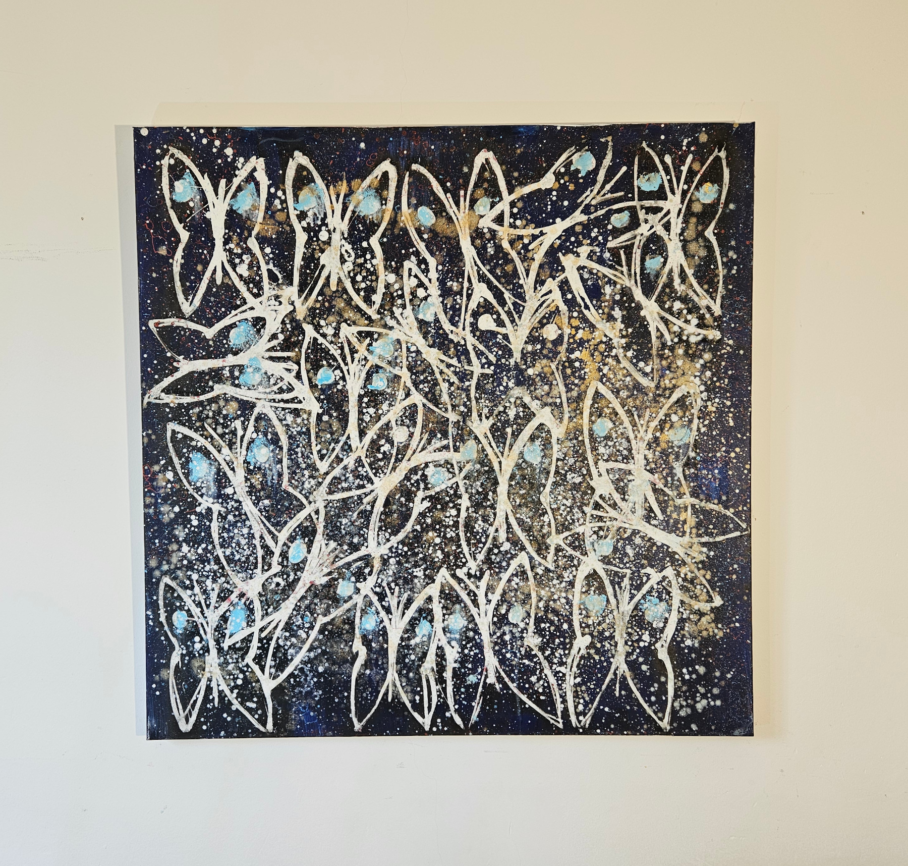 Contemporary figurative artwork, painting by the french artist Guillaume Marchat, depicting light blue and white butterflies on a dark blue background, flying in all directions. The splattered paint creates a sense of movement across the canvas.