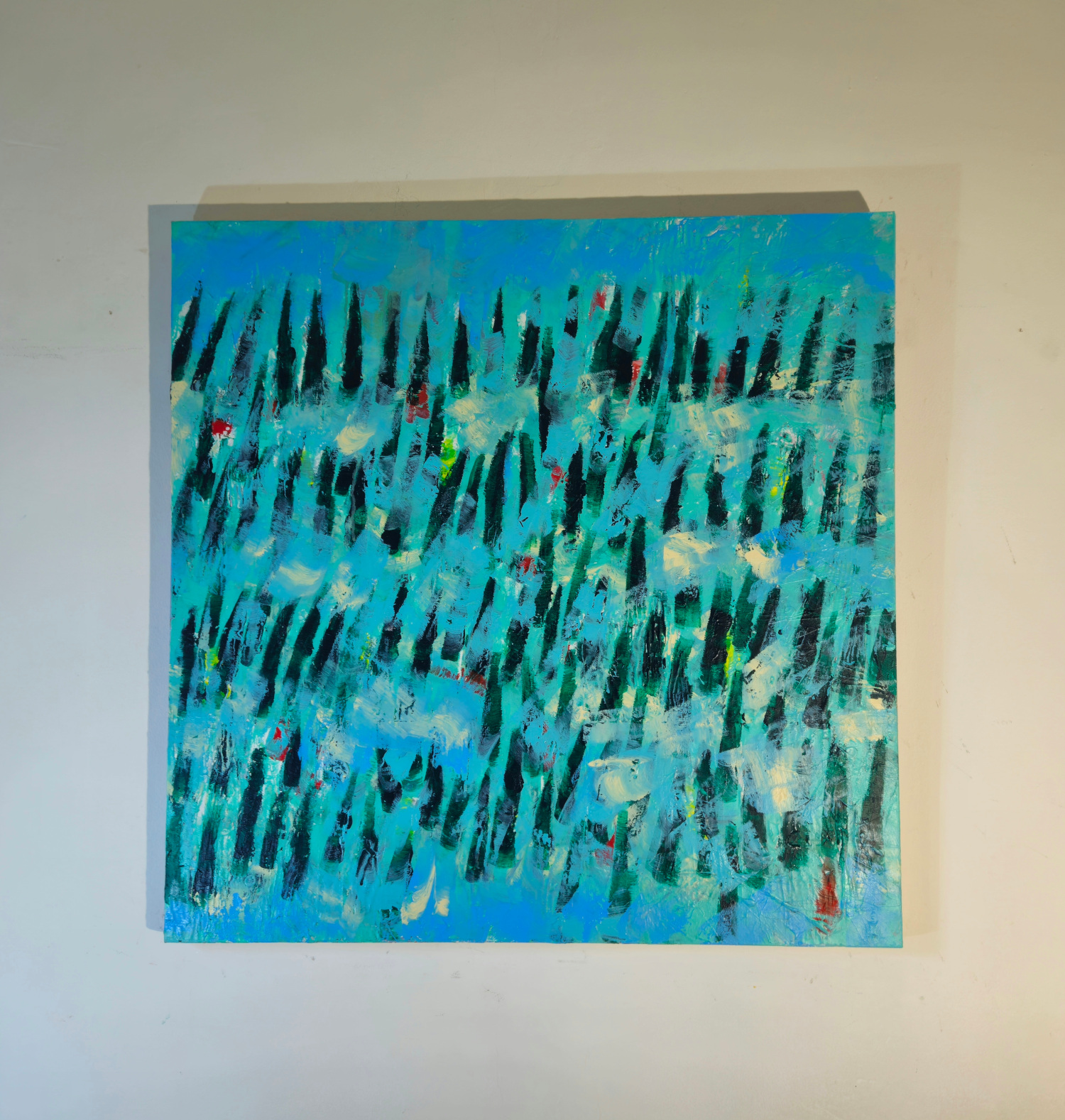 Unique contemporary figurative painting by the French artist Guillaume Marchat, depicting a blue landscape with fir trees in the mountains.