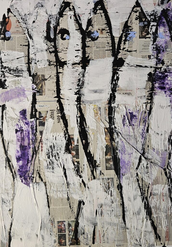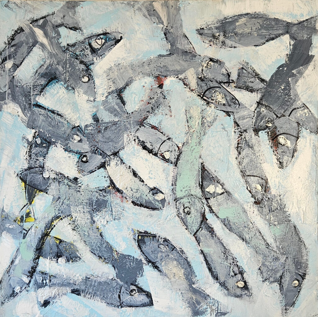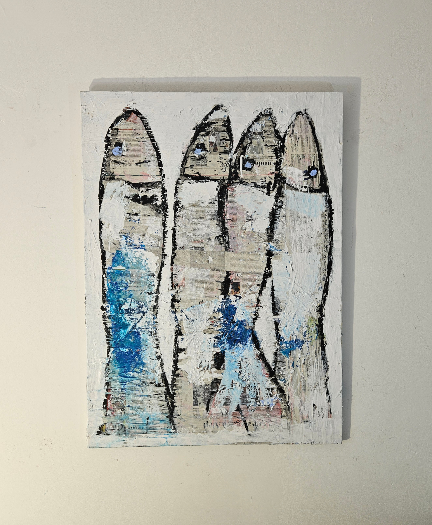 Contemporary artwork painted by the french artist Guillaume Marchat, showing bleu sardines on paper, acrylic painting and collage on cloth.