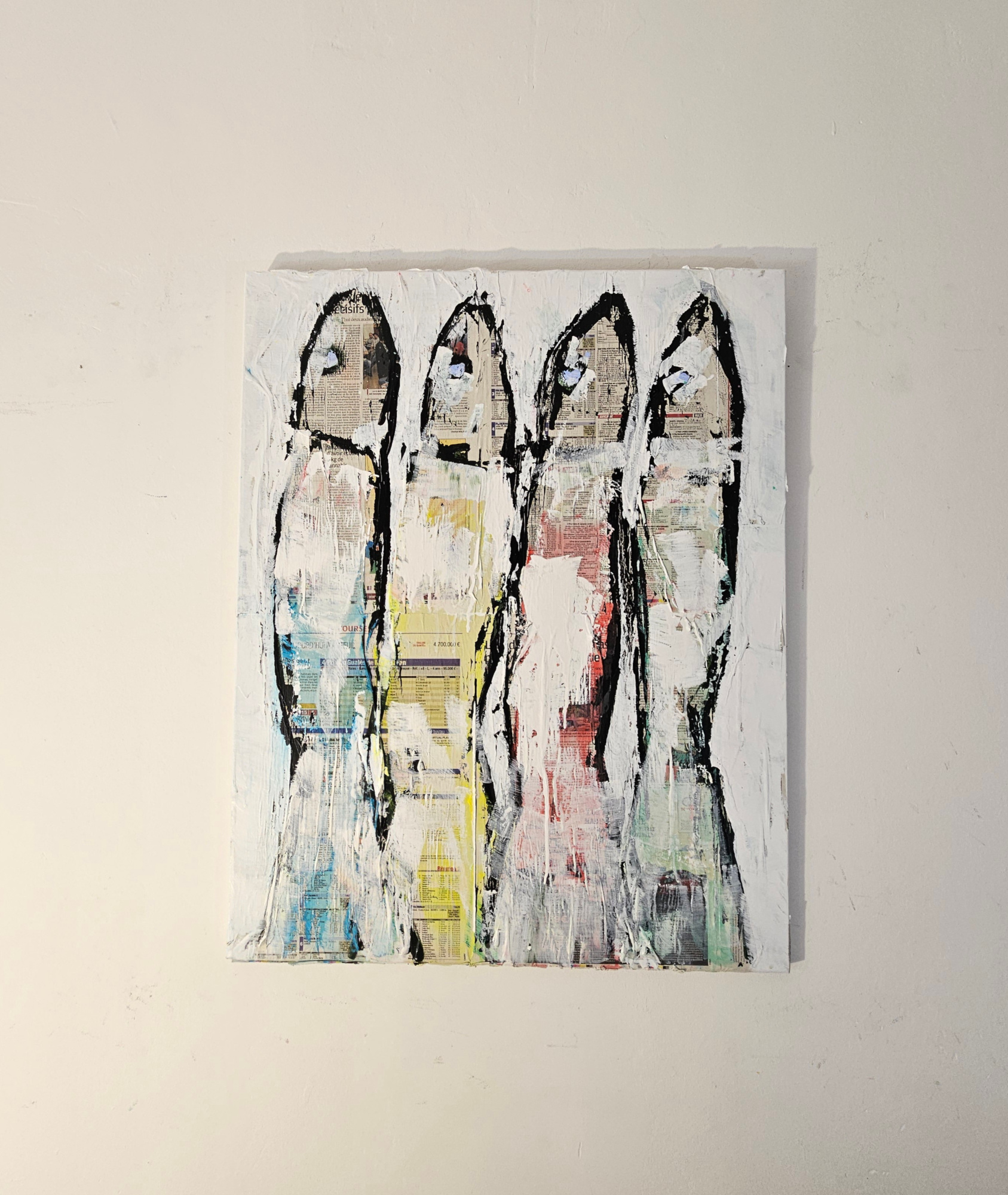 Contemporary artwork painted by the french artist Guillaume Marchat, showing bleu, yellow, red, green, sardines on paper, acrylic painting and collage on cloth.