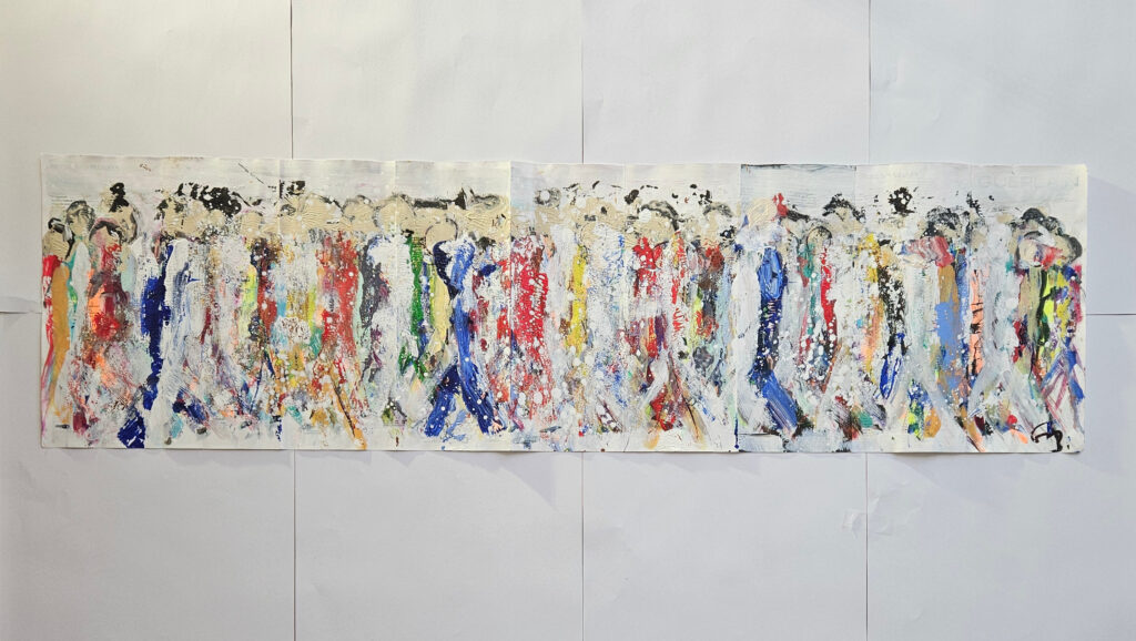 In this artwork, I wanted to capture human effervescence—these walking silhouettes tell a continuous flow of lives and stories. Through vivid colors and naïve forms, I celebrate diversity and movement. It infuses a positive, vibrant dynamism, ready to animate and enliven the space it inhabits, inviting the viewer to feel the energy of crowds in motion. Acrylic painting on cardboard, to be framed. This idea came to me while I was standing in line to enter the International Contemporary Art Fair in Paris.
