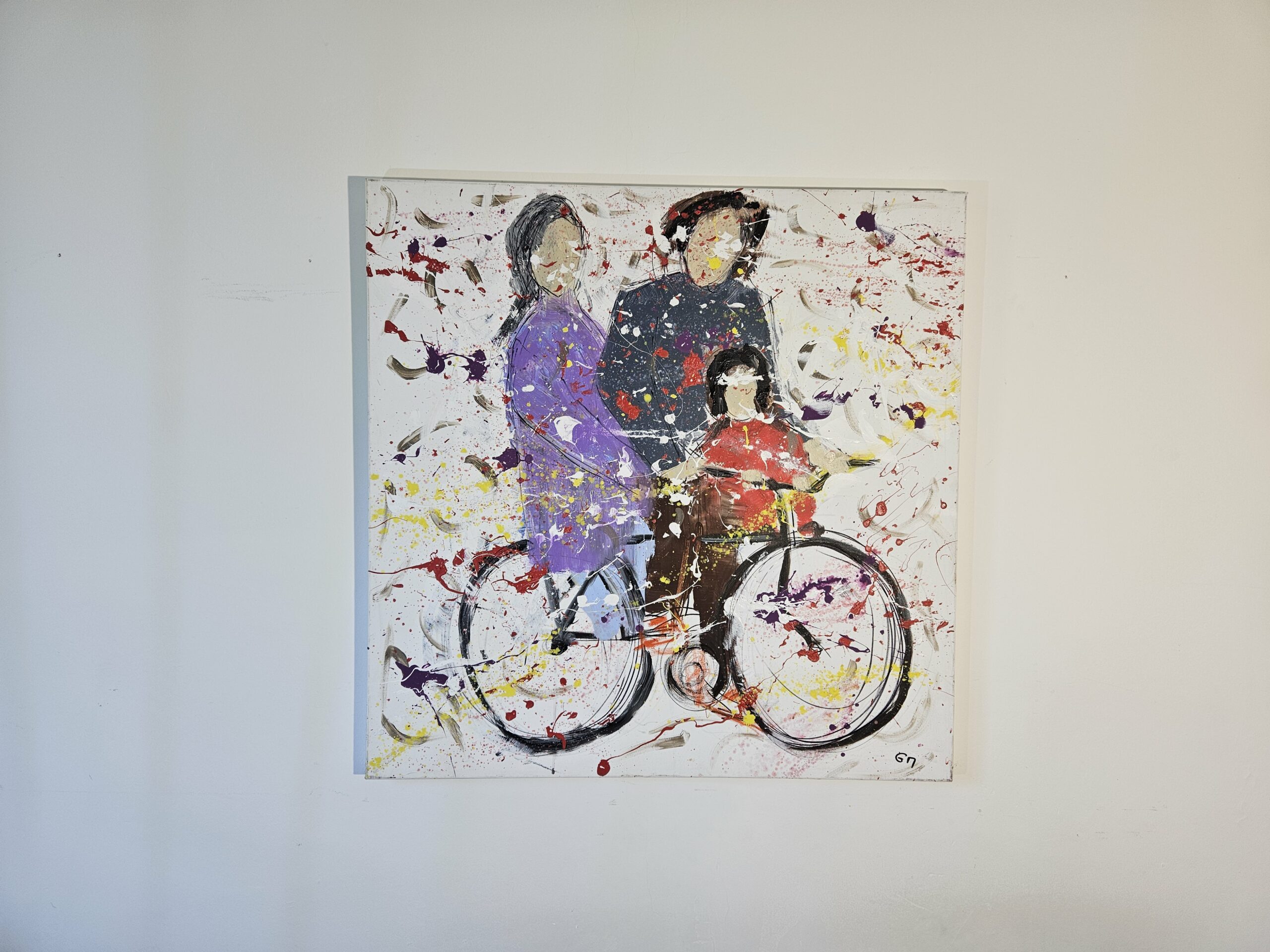 Contemporary minimalist painting by the french artist Guillaume Marchat, depicting a family on a single bicycle. The paint splashes create a sense of movement and speed.