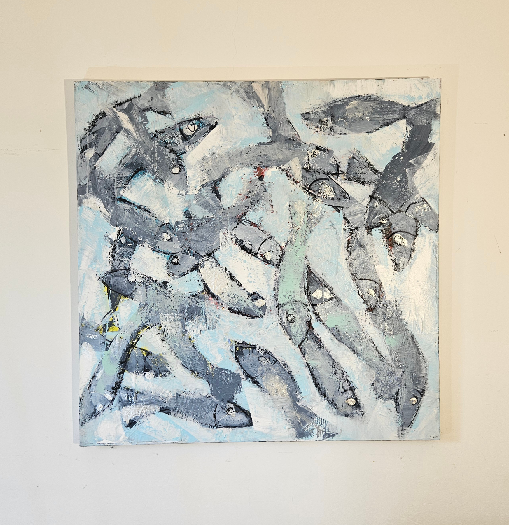 Contemporary artwork painted by the french artist Guillaume Marchat, showing dark grey fishes swimming in the bleu light sea. The fishes seem moving on the cloth.