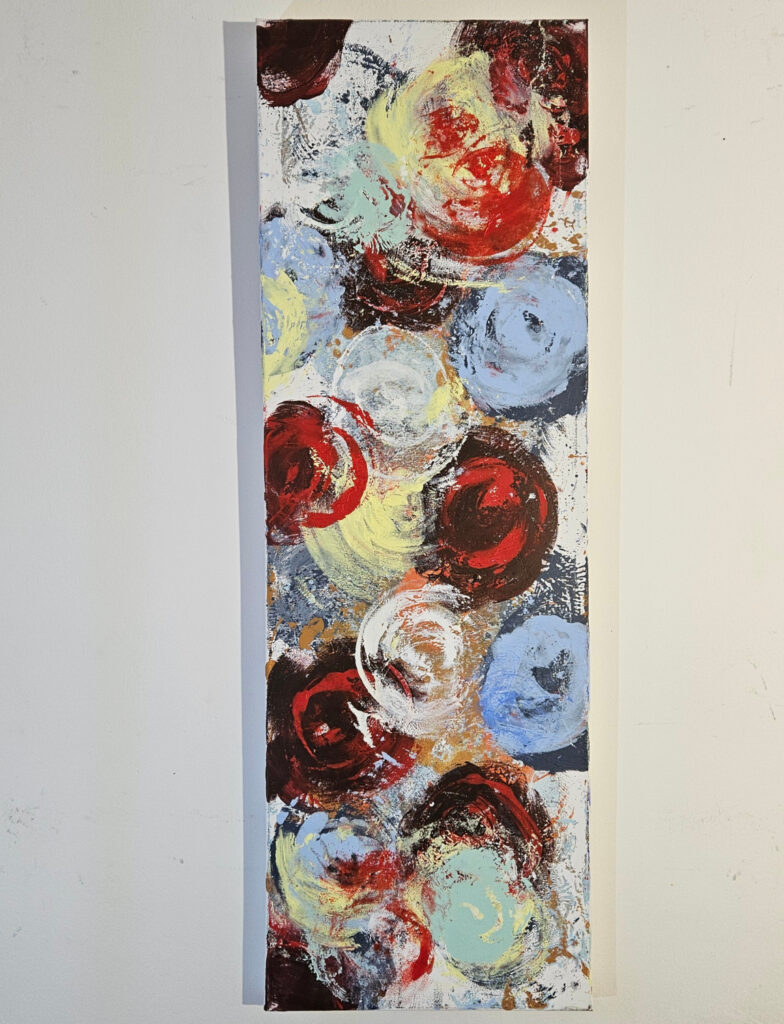 Contemporary abstract artwork, painting by the French artist Guillaume Marchat, suggesting red and yellow flowers. This 40×120 cm canvas can be combined with others to create a large decorative panel.