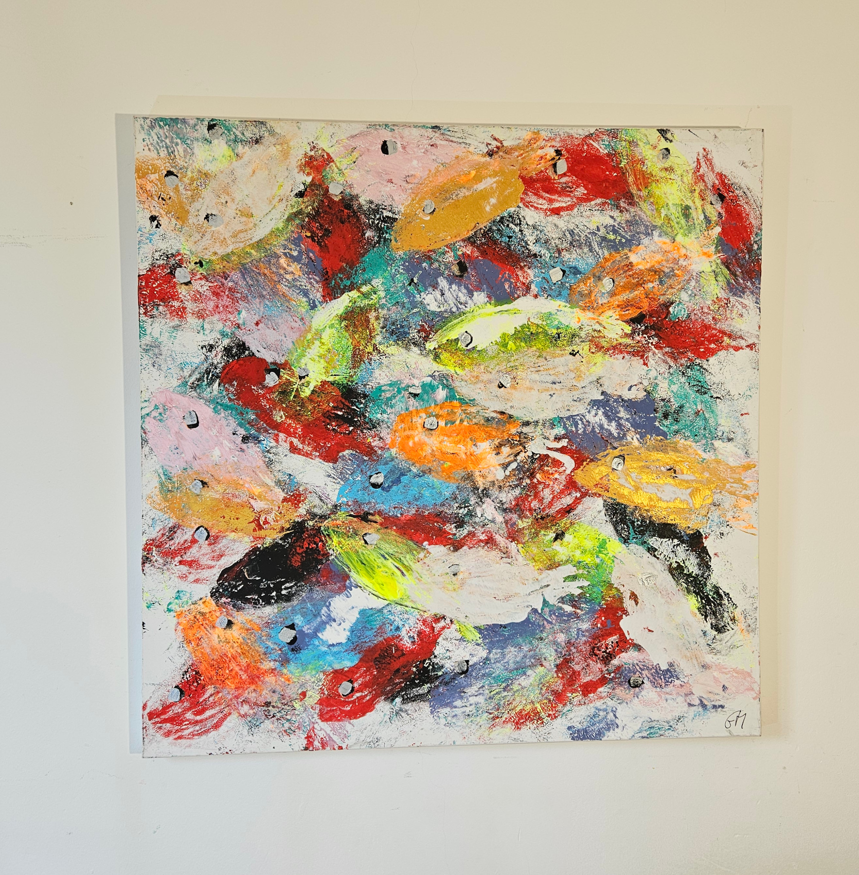 Contemporary figurative artwork, painting by the French artist Guillaume Marchat, depicting fluorescent-colored fish. The fish appear to be swimming across the canvas.