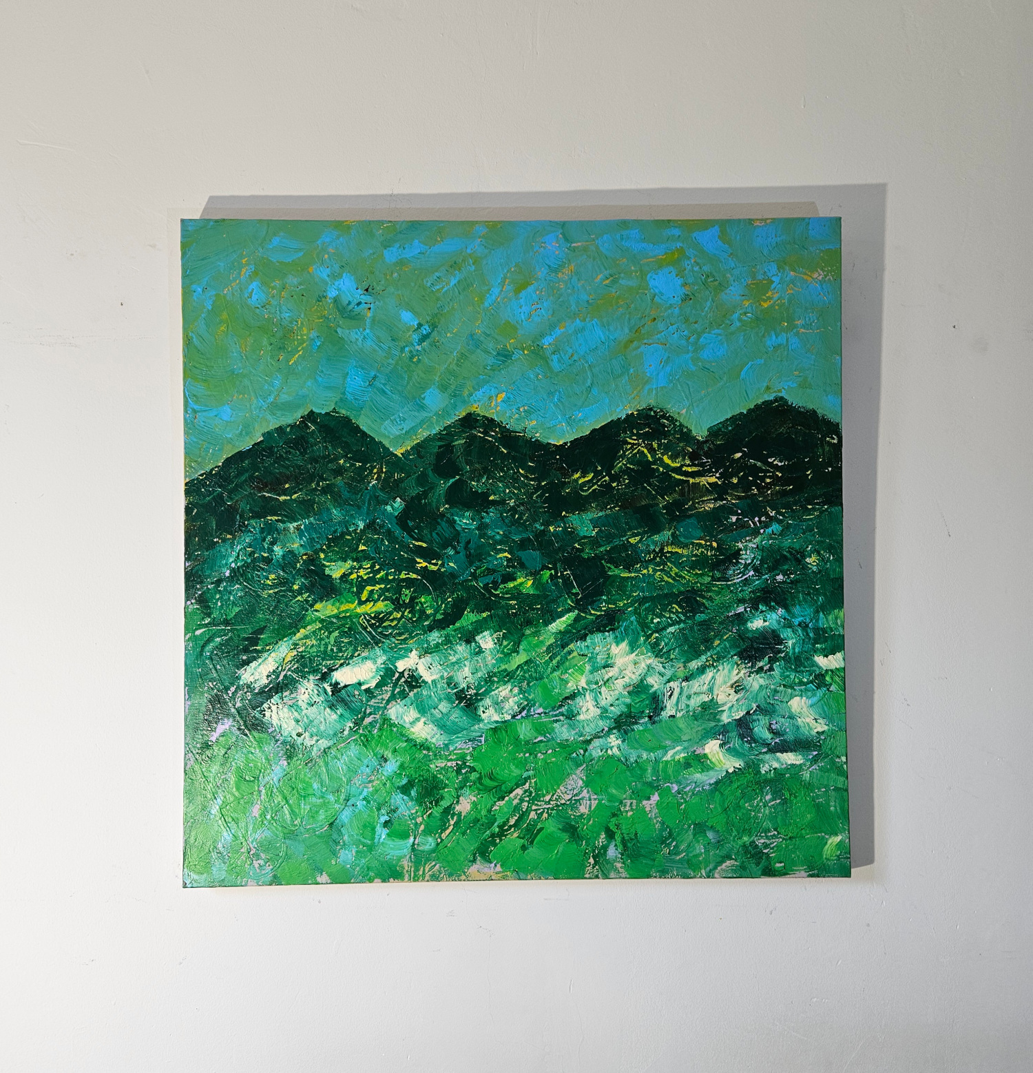 Unique contemporary figurative painting by hte French artist Guillaume Marchat, depicting a green landscape with mountains in the background.