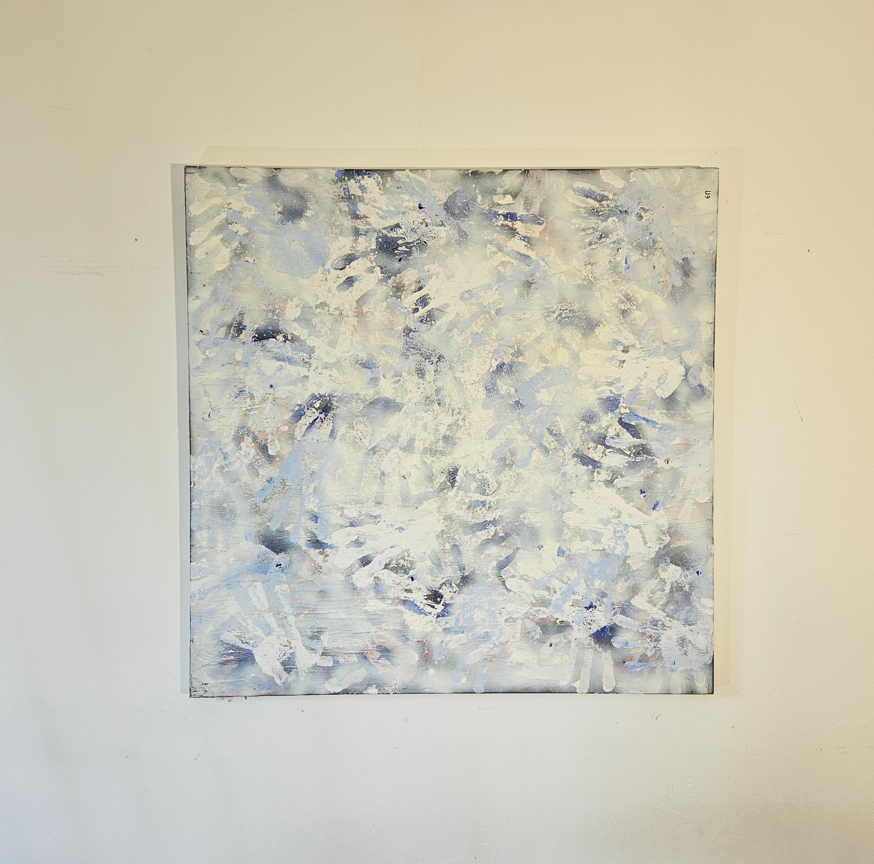 Contemporary abstract artwork, painting by the French artist Guillaume Marchat. Blue and white handprints, symbolizing the passage of our ancestors.