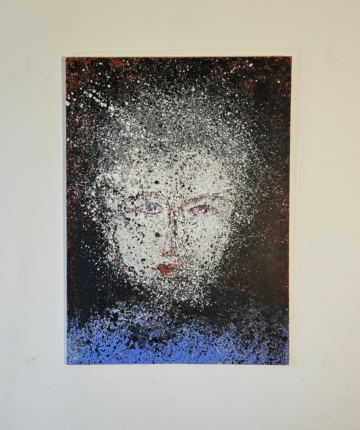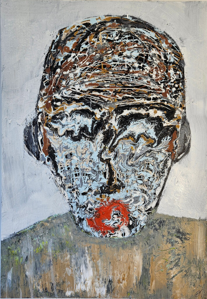 Painting by the French artist Guillaume Marchat. Contemporary painting, portrait of a shy child with red eyes who has just cried. The acrylic paint splattered on the canvas amplifies the feeling of sadness and shyness, inspired by Amadeo Modigliani