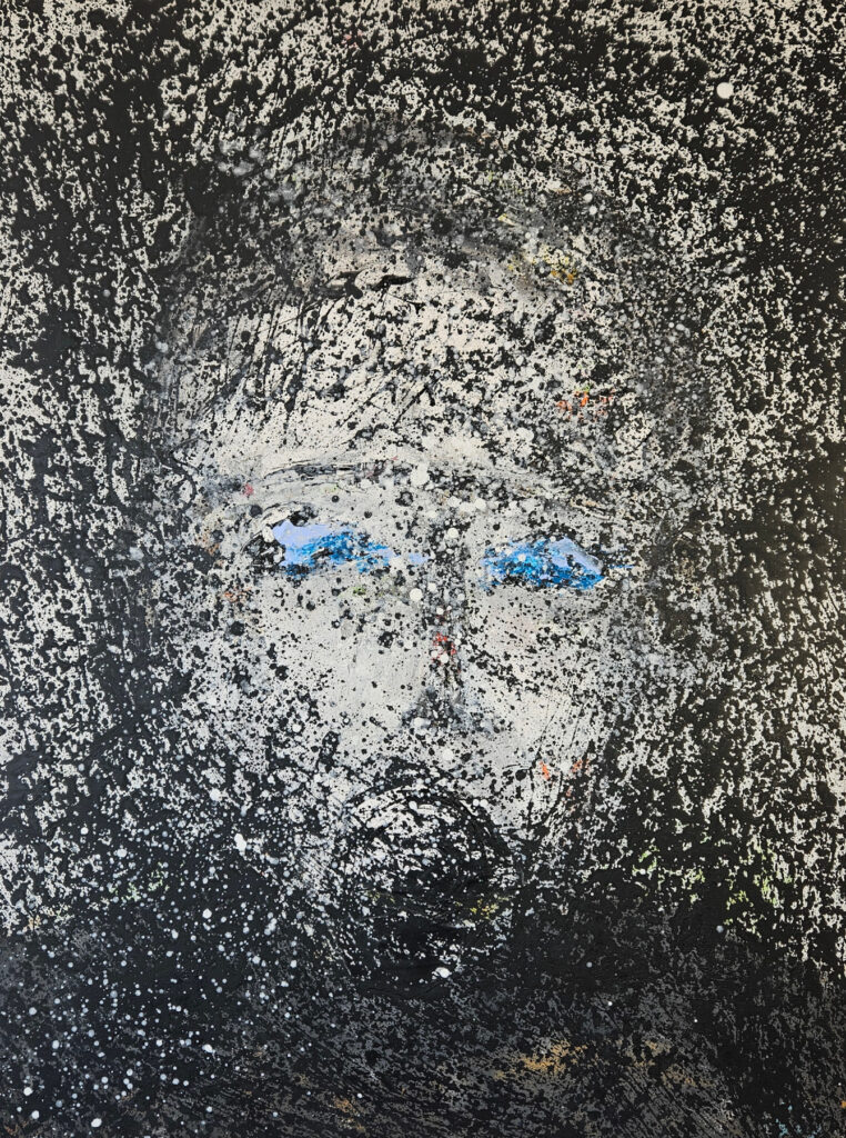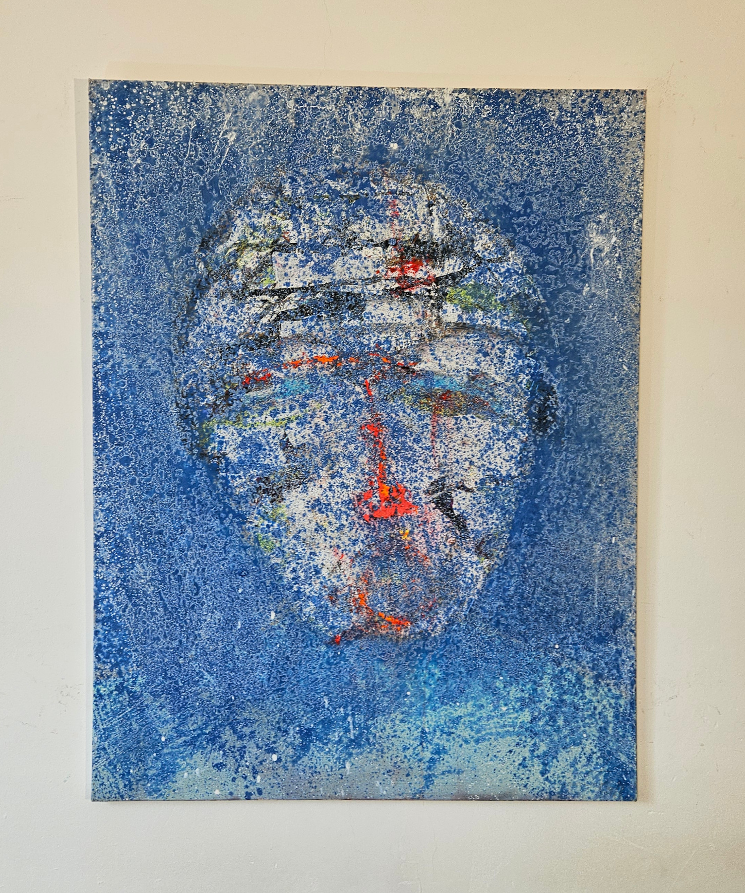 Acrylic artwork by the French artist Guillaume Marchat, depicting a clown with an orange nose and an open mouth as if speaking to children. The splashes of blue paint on the canvas add cheerfulness and mystery to this clown, who could represent any one of us.