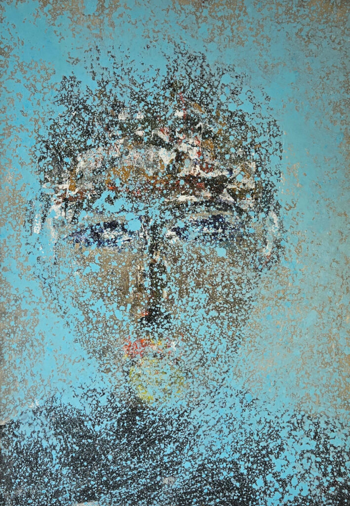 Unique contemporary artwork, acrylic on canvas 116×89 cm, painted by the French artist Guillaume Marchat, a portrait depicting a man with a blurred mouth, as if prevented from speaking. This head on a blue background, the color of hope, symbolizes freedom of expression.