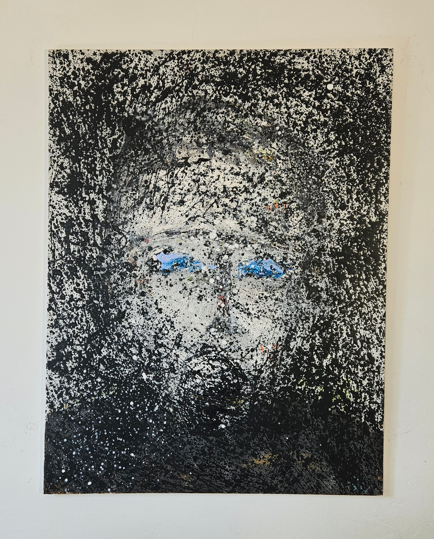 Portrait painted by Guillaume Marchat, depicting the head of an unhappy man screaming his despair, a feeling intensified by the black paint splattered on the canvas.