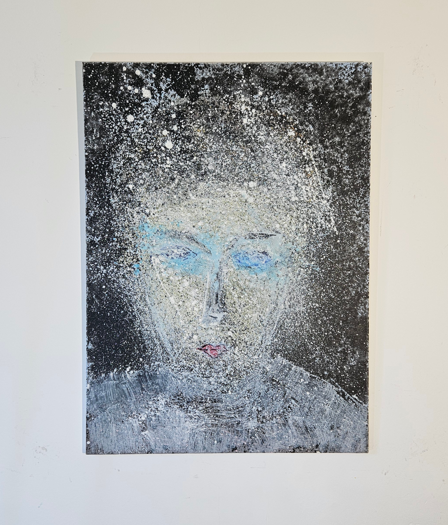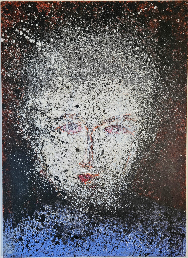 This painting depicts a woman with blue eyes. The paint projected onto the canvas suggests the constant movement of the particles that make up this face. According to quantum physics, we are nothing but waves, and we become particles when we are observed.