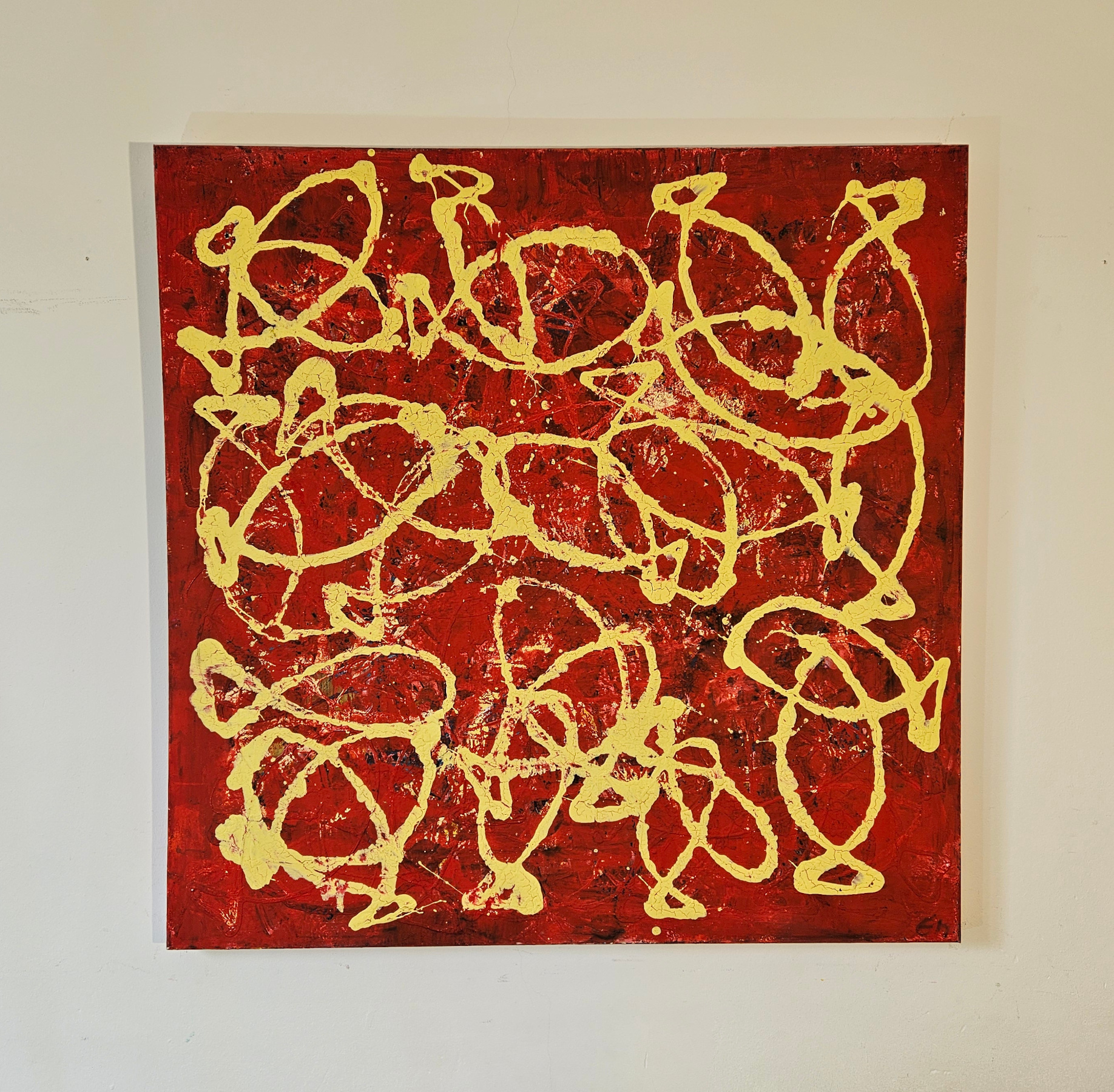 Contemporary abstract painting by the French artist Guillaume Marchat, suggesting ivory fish on a red background. This minimalist painting exudes a sense of harmony.