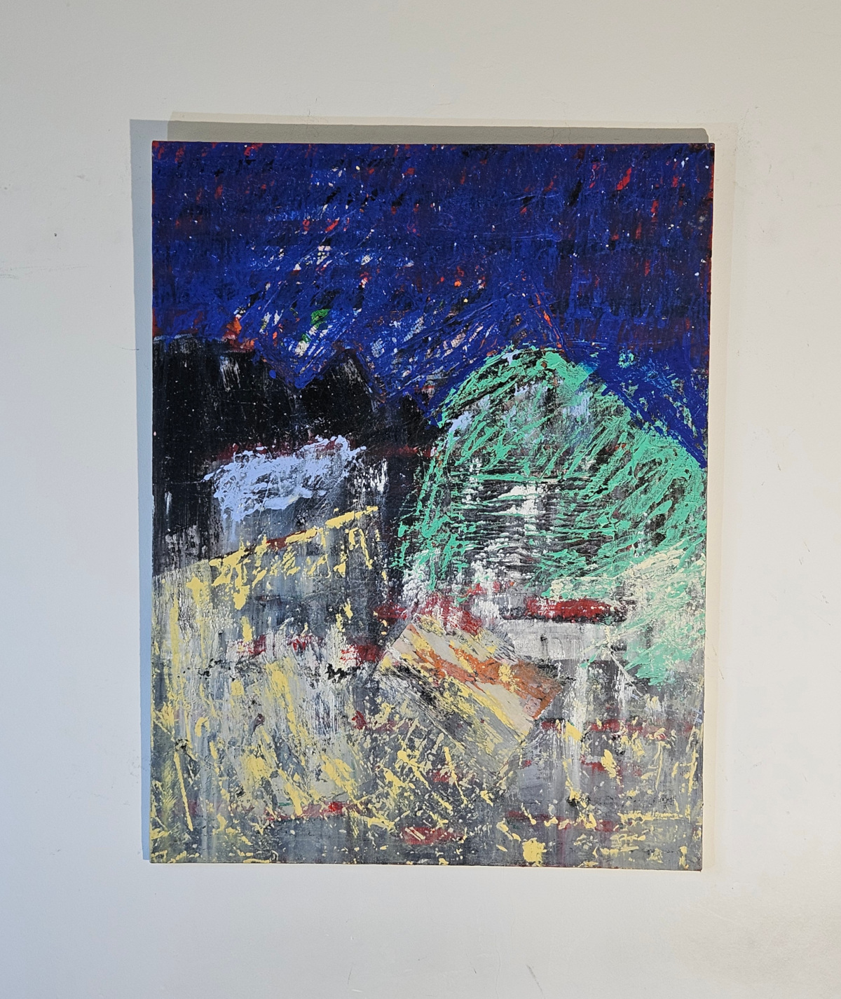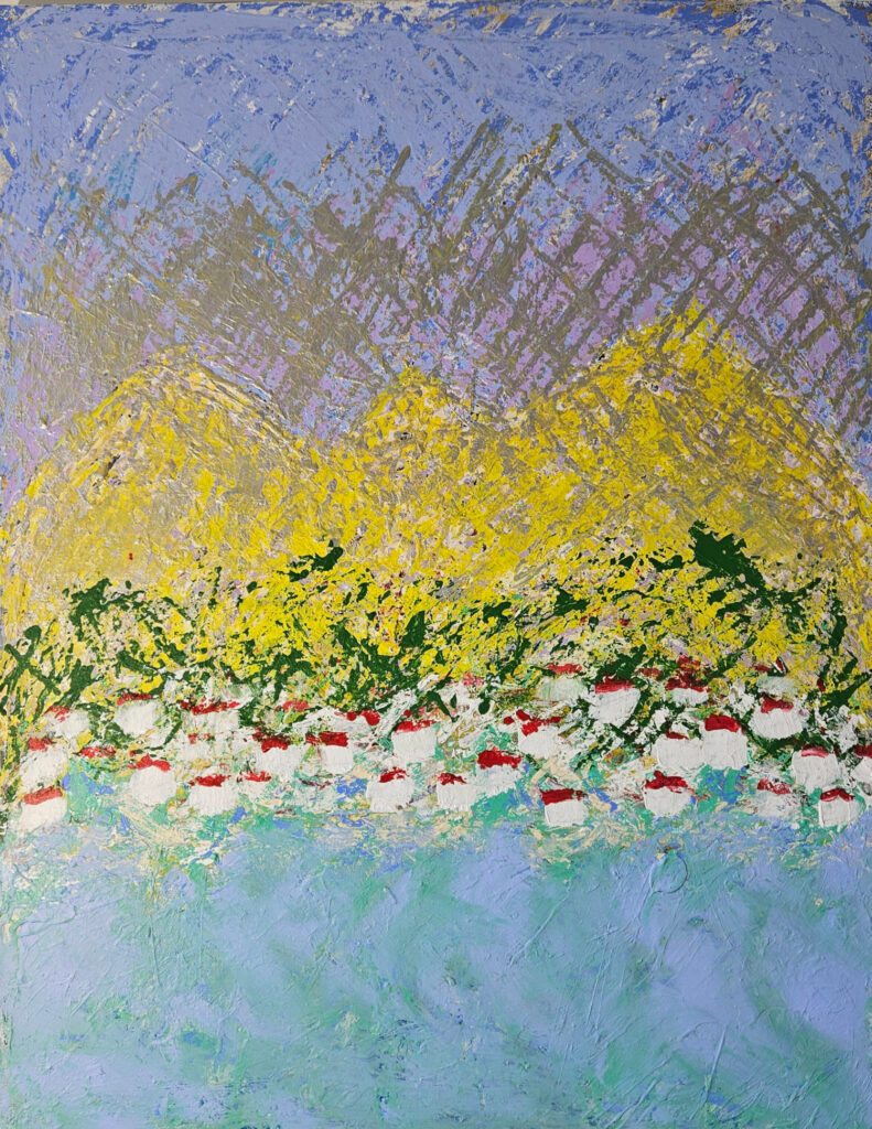 Contemporary semi-figurative, semi-abstract painting by the French artsit Guillaume Marchat, depicting a landscape at dusk. The striated painting adds volume to the artwork.