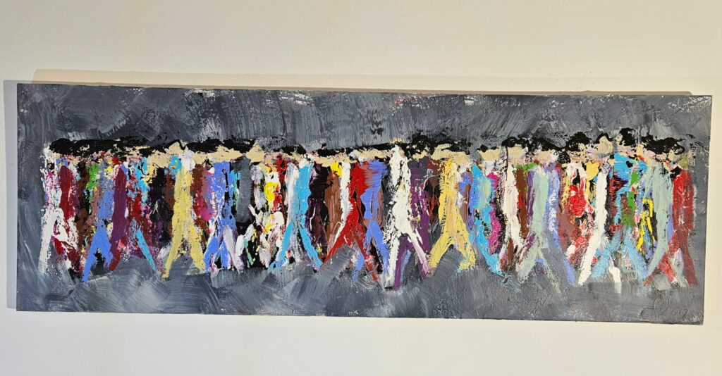 Abstract acrylic artwork by the French artist Guillaume Marchat, painting on cardboard, a plan of the FIAC, framed under glass, suggesting men walking—an idea that came to the artist while waiting in line to enter the International Contemporary Art Fair in Paris.