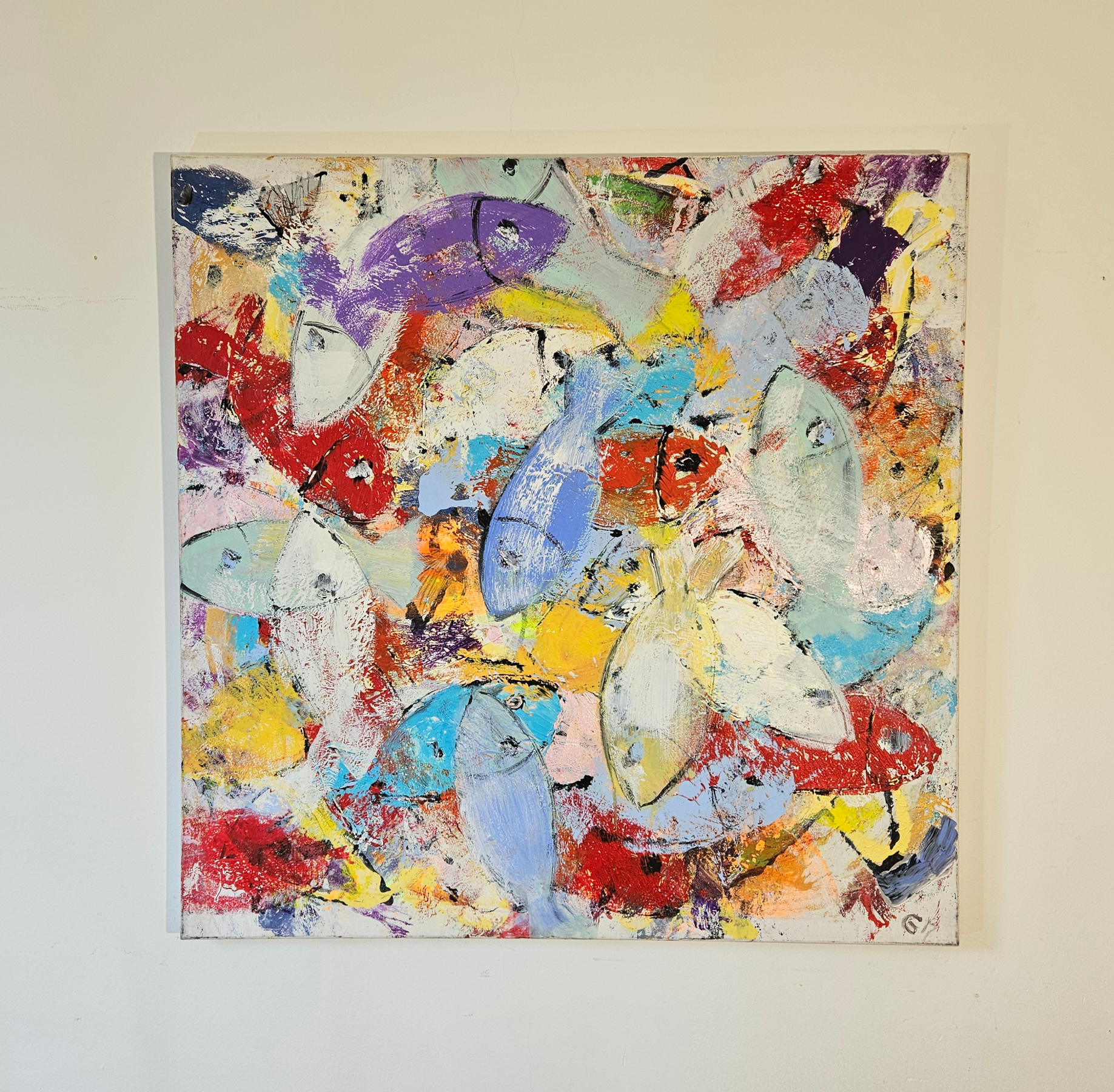 A beautiful contemporary figurative artwork, painting by the French artist Guillaume Marchat, depicting multicolored fish. The fish appear to be swimming across the canvas. The painting is very bright and luminous.
