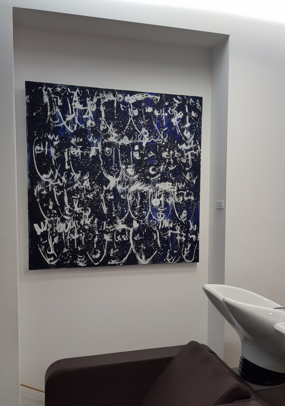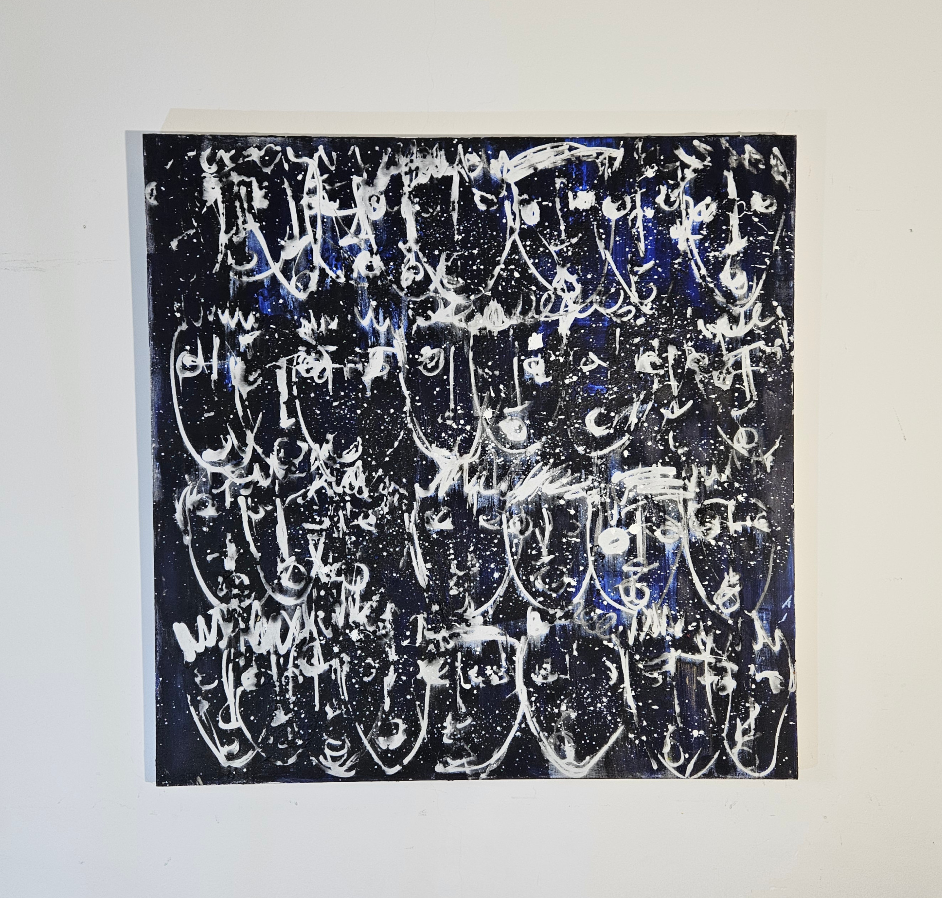 Contemporary figurative artwork, painting by the French artist Guillaume Marchat, depicting white heads on a blue background. A minimalist painting representing faces.