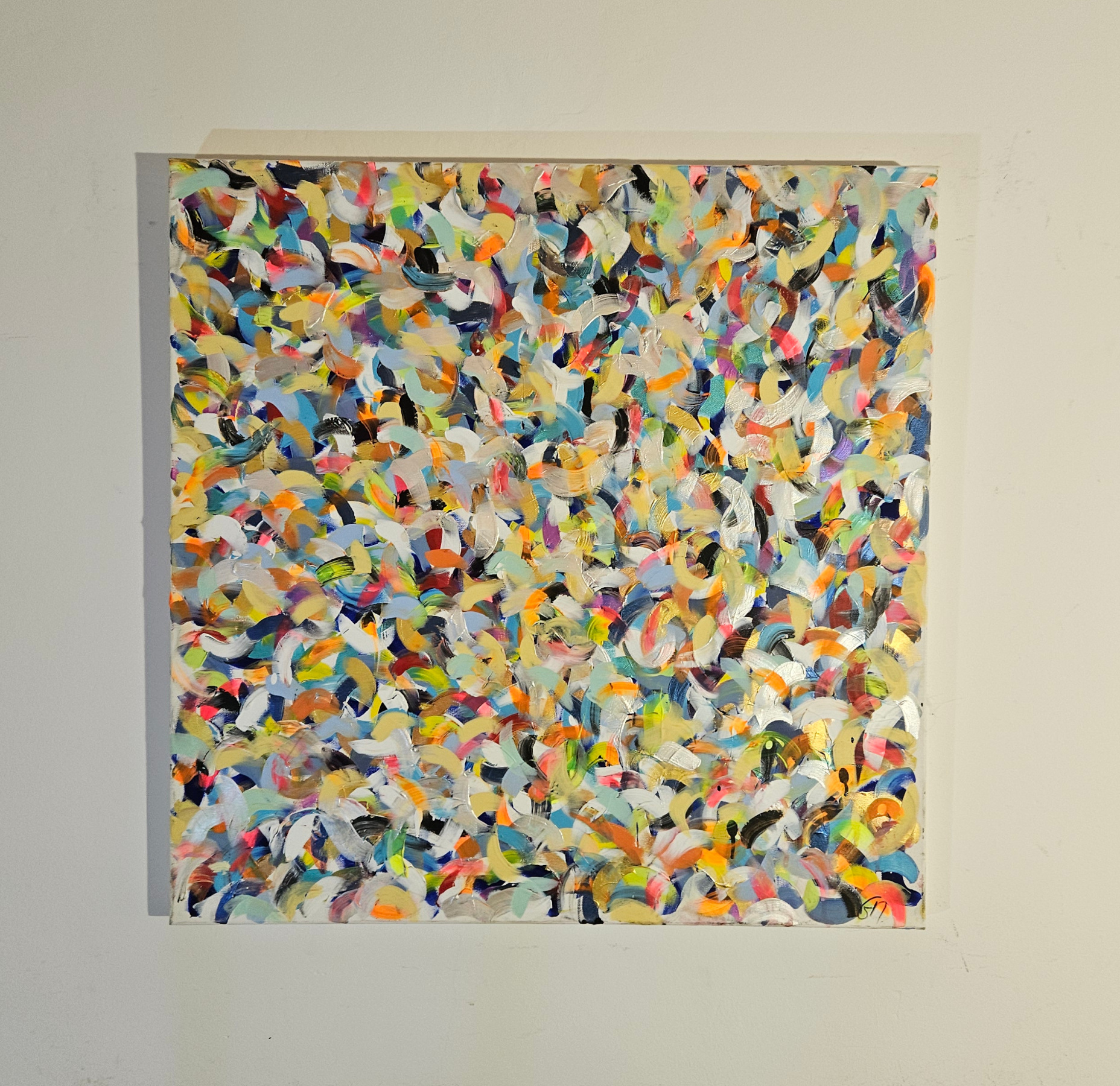 Contemporary abstract painting by the French artist Guillaume Marchat, a blend of large commas in a multitude of colors layered over one another to create a harmonious composition with a predominance of yellow and blue.