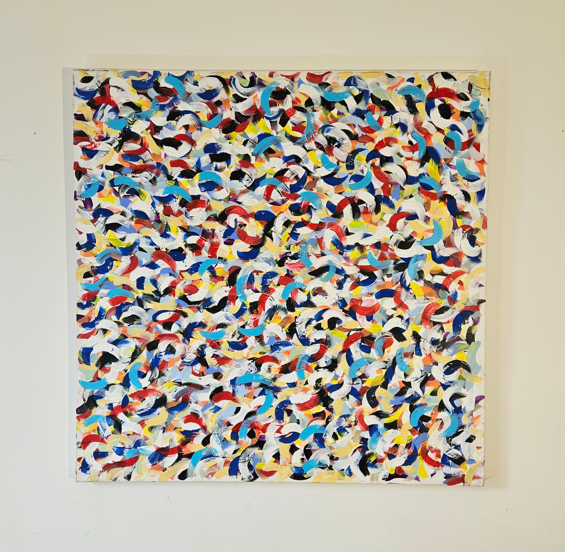 Contemporary abstract painting by th French artist Guillaume Marchat, a blend of commas in a multitude of colors layered over one another to create a harmonious composition with a predominance of yellow and blue.