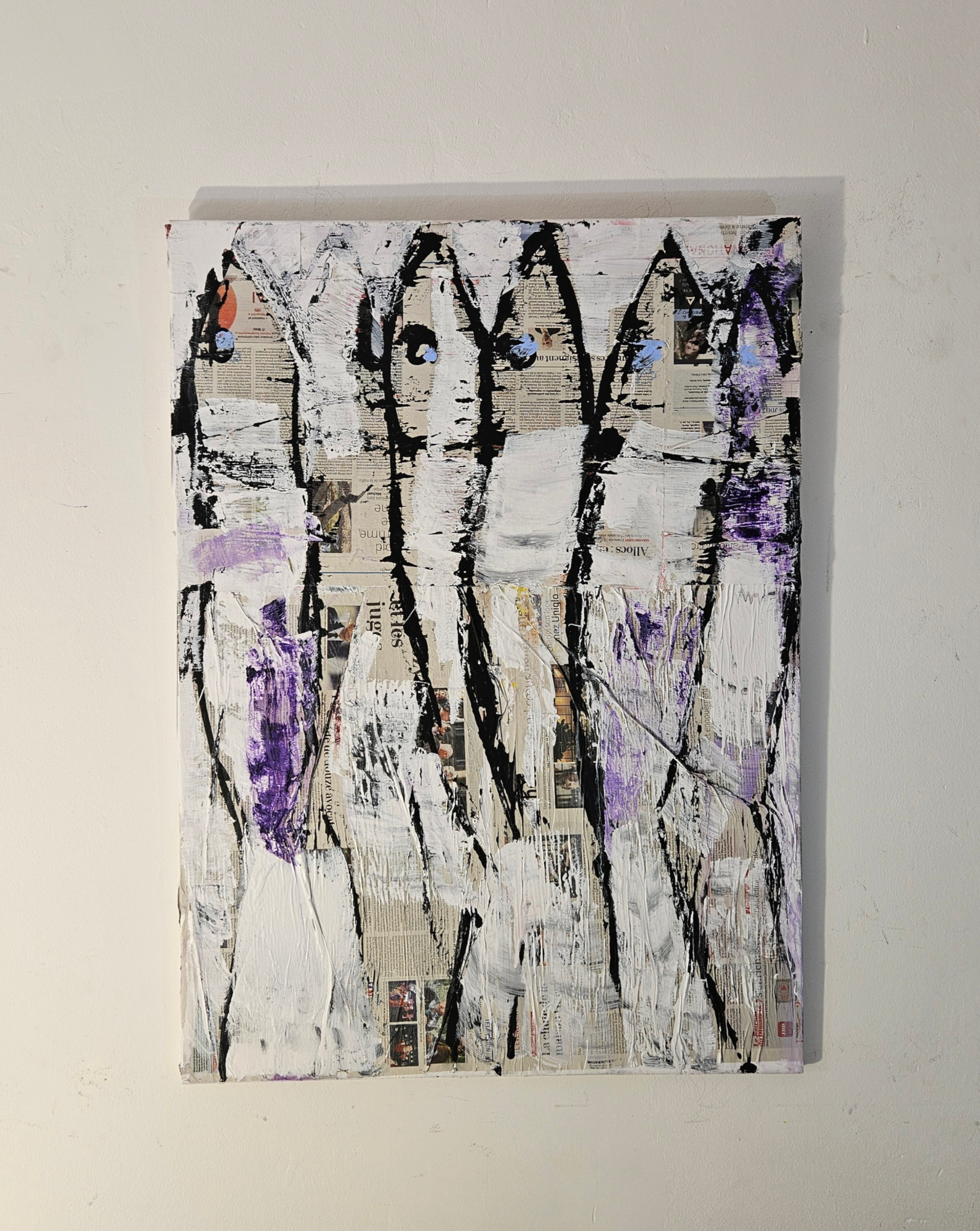 Contemporary artwork painted by the french artist Guillaume Marchat, showing purple sardines on paper, acrylic painting and collage on cloth.