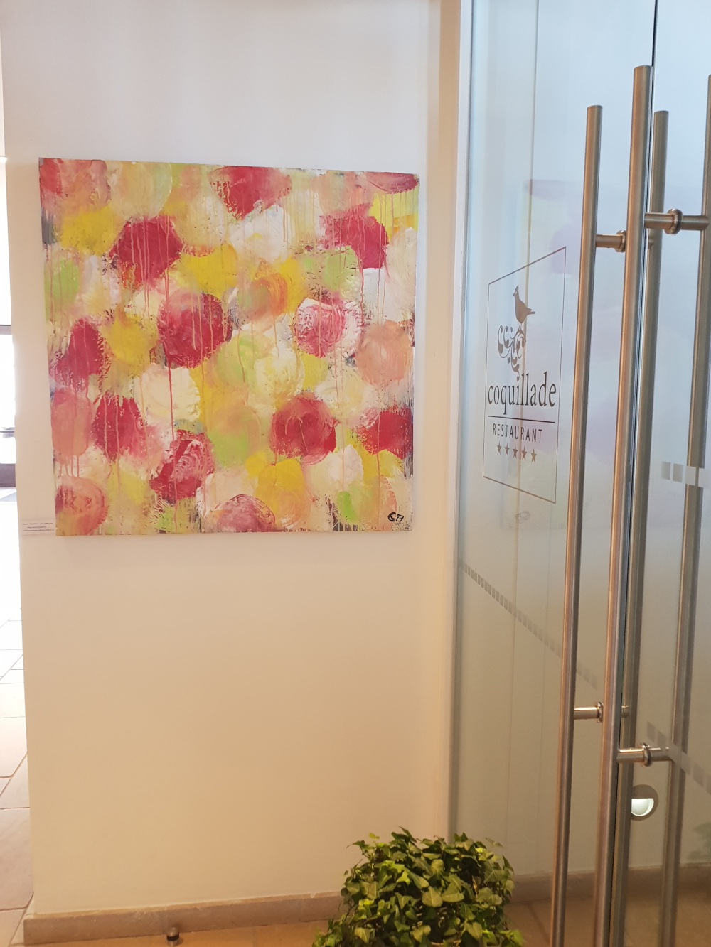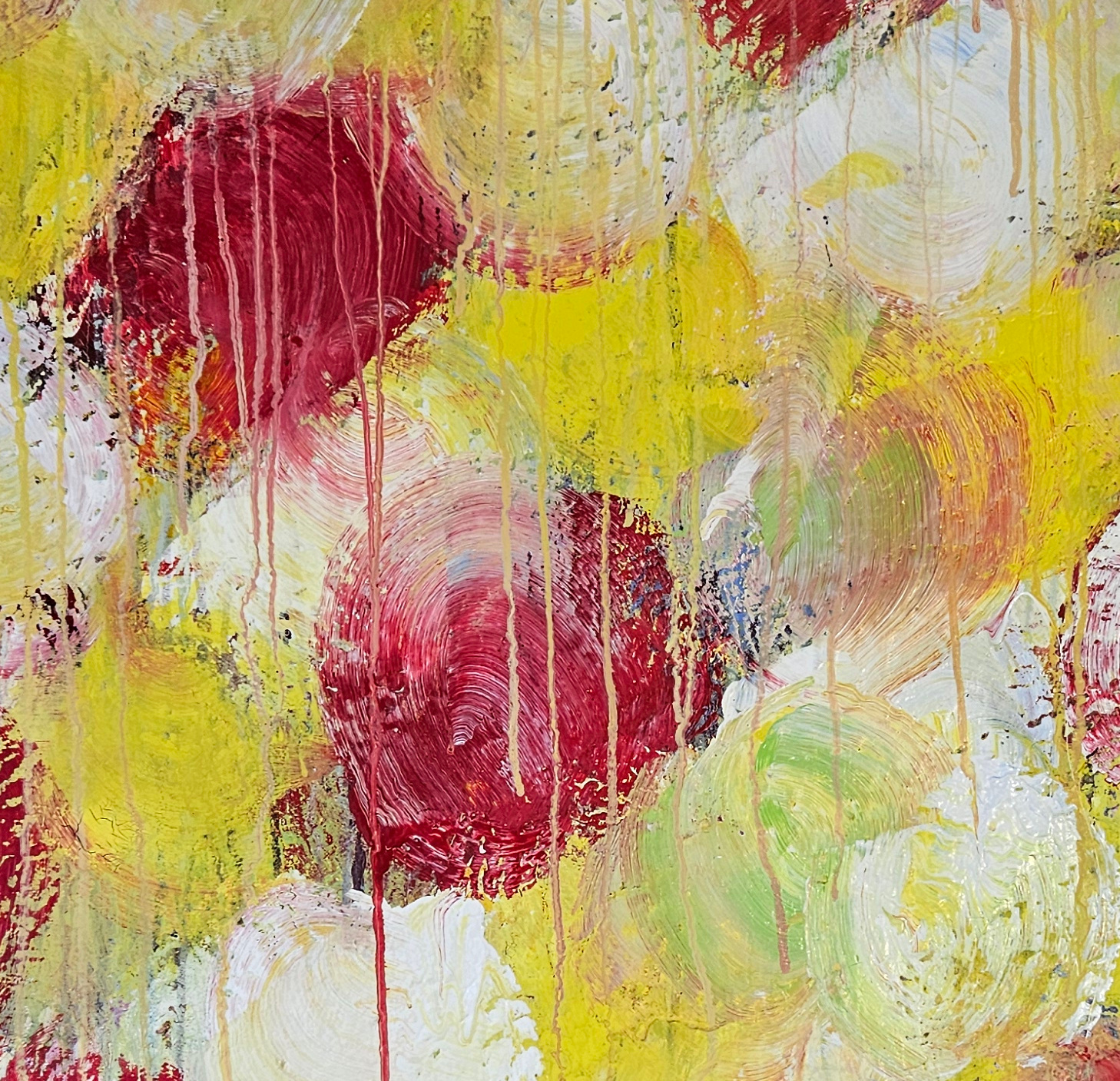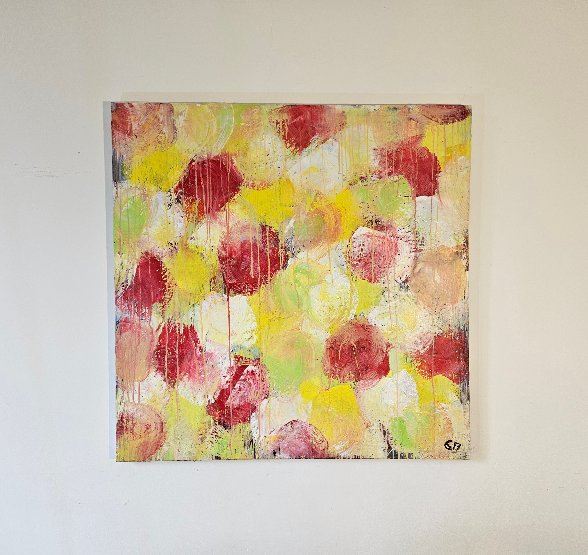 Contemporary abstract artwork painting by the French painter Guillaume Marchat, depicting yellow, red, green, and white flowers, harmoniously grouped