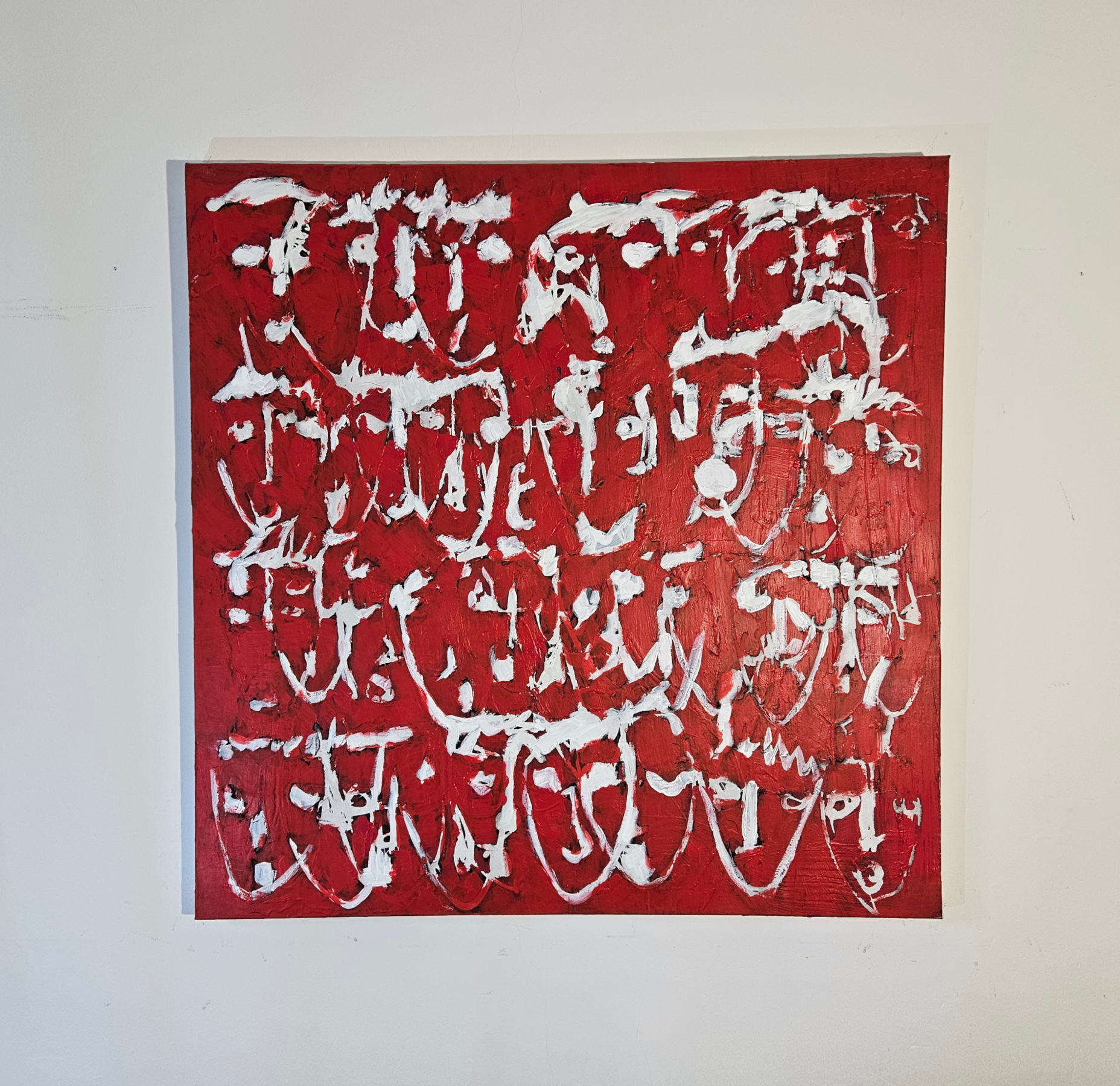 Contemporary figurative painting by the French artist Guillaume Marchat, depicting white heads on a red background. Minimalist painting representing faces.