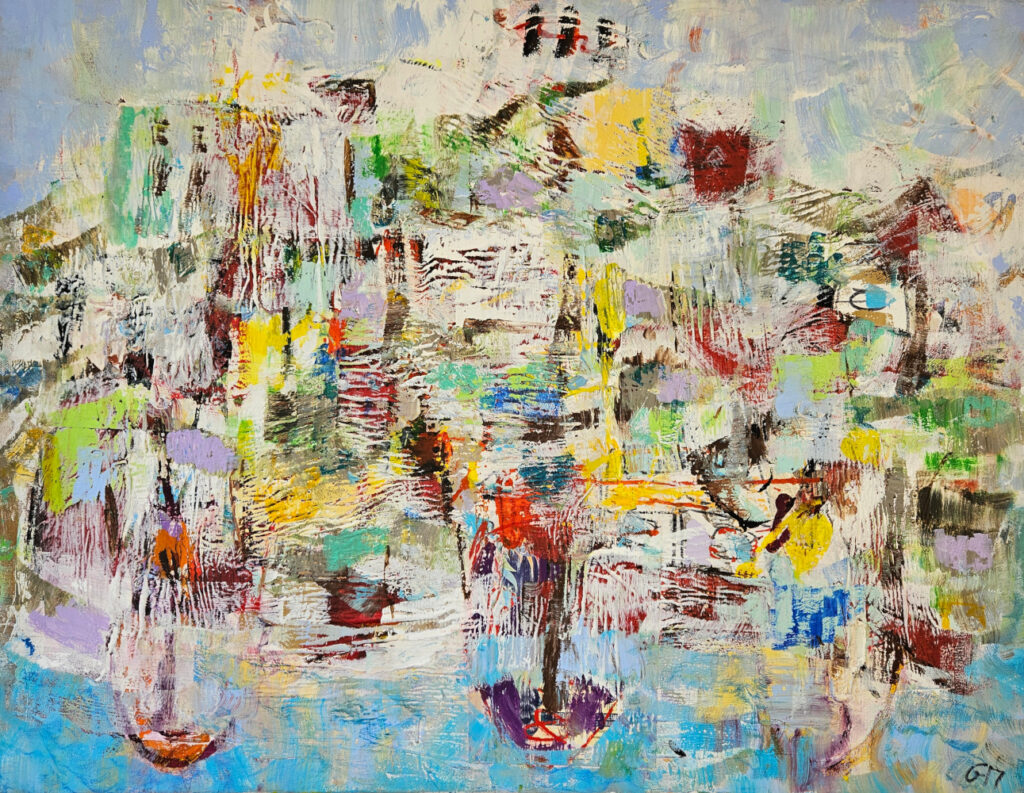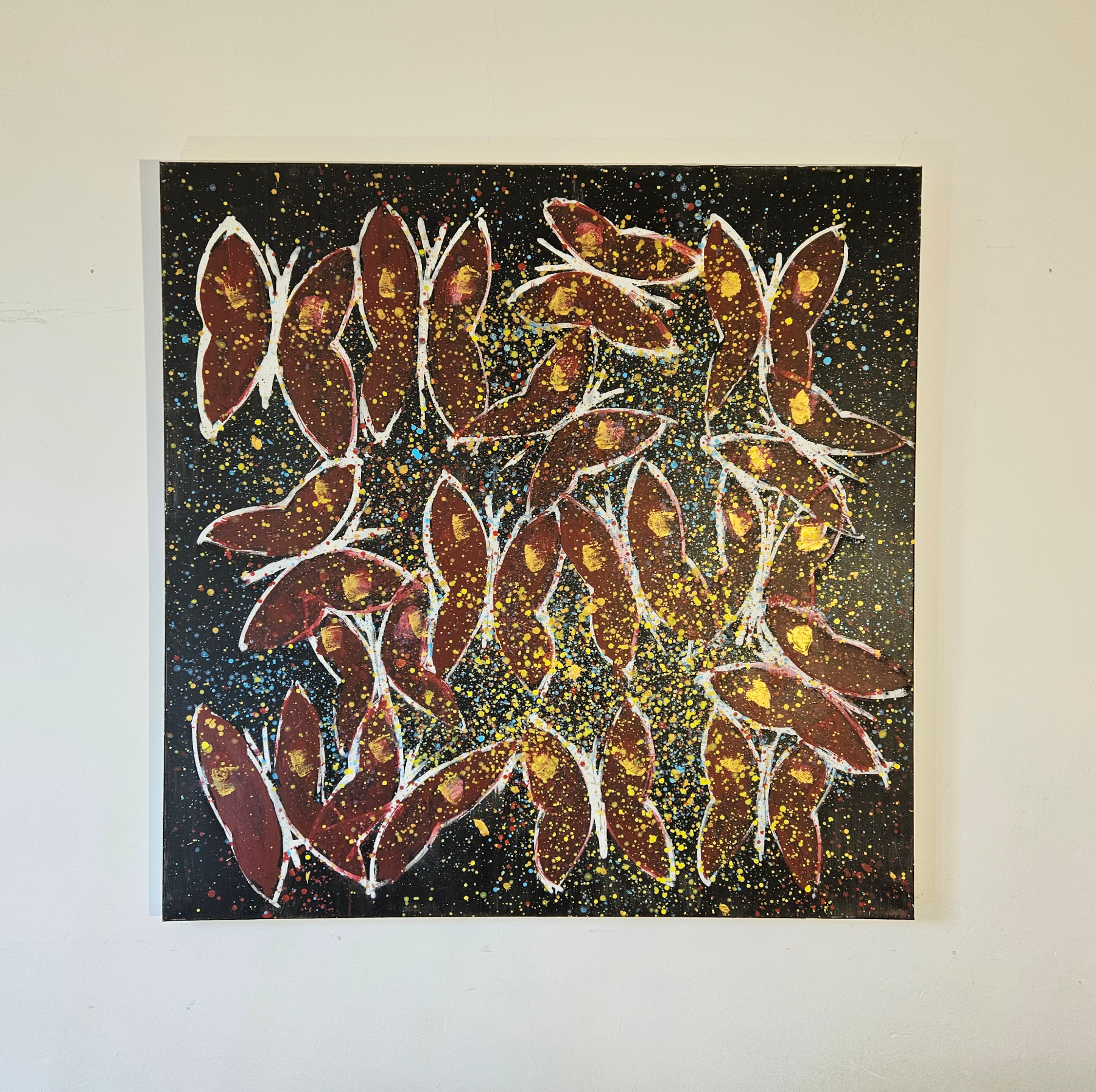 Contemporary figurative artwork, painting by the French artist Guillaume Marchat, depicting red and gold butterflies flying in all directions. The splattered paint creates a sense of movement on the canvas.