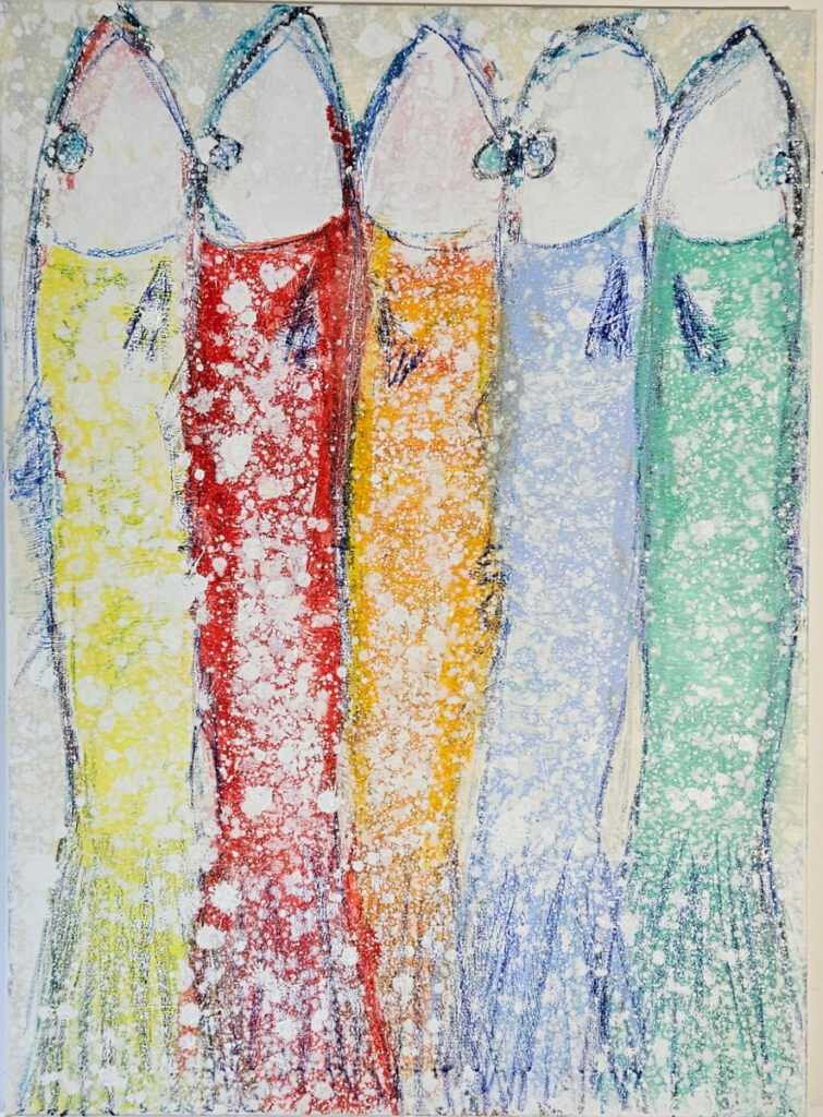 Contemporary painting by the French artist Guillaume Marchat. The fish appear to be swimming across the canvas.