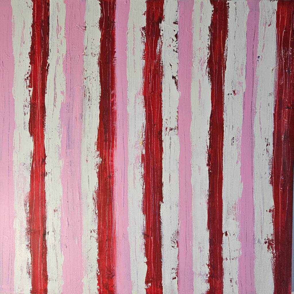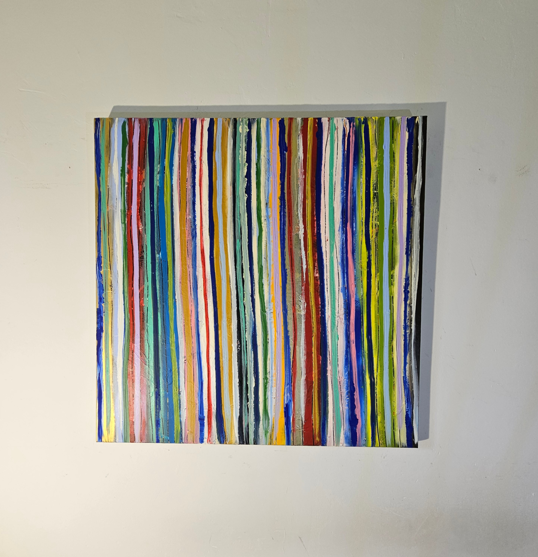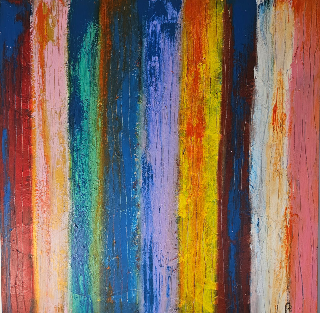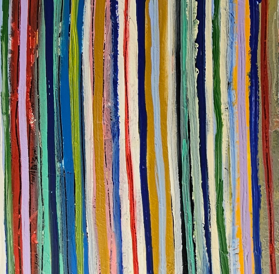 Contemporary abstract painting by the french artist Guillaume Marchat, depicting thin multicolored stripes, luminous bands that seem to move across the canvas.