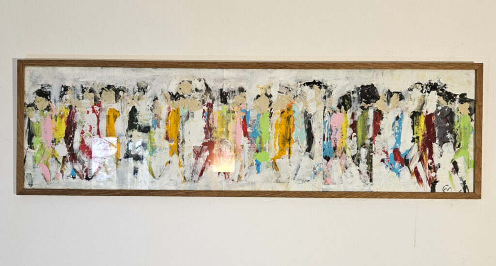 Abstract acrylic artwork by the French artist Guillaume Marchat, painting on cardboard, a plan of the FIAC, framed under glass, suggesting men walking—an idea that came to the artist while waiting in line to enter the International Contemporary Art Fair in Paris.