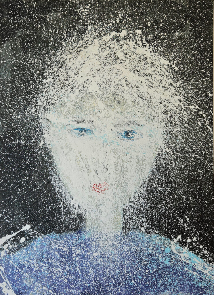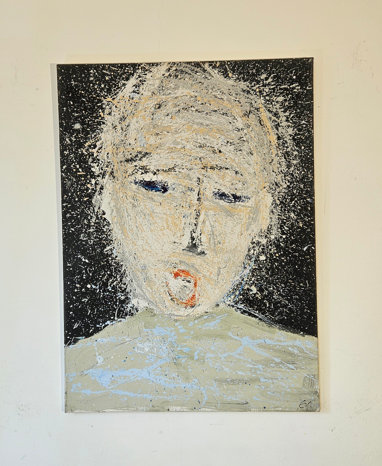 Very beautiful portrait of a child laughing and moving while speaking. The movement of the head and the child’s joy can be felt. Figurative contemporary painting by the French artist Guillaume Marchat.