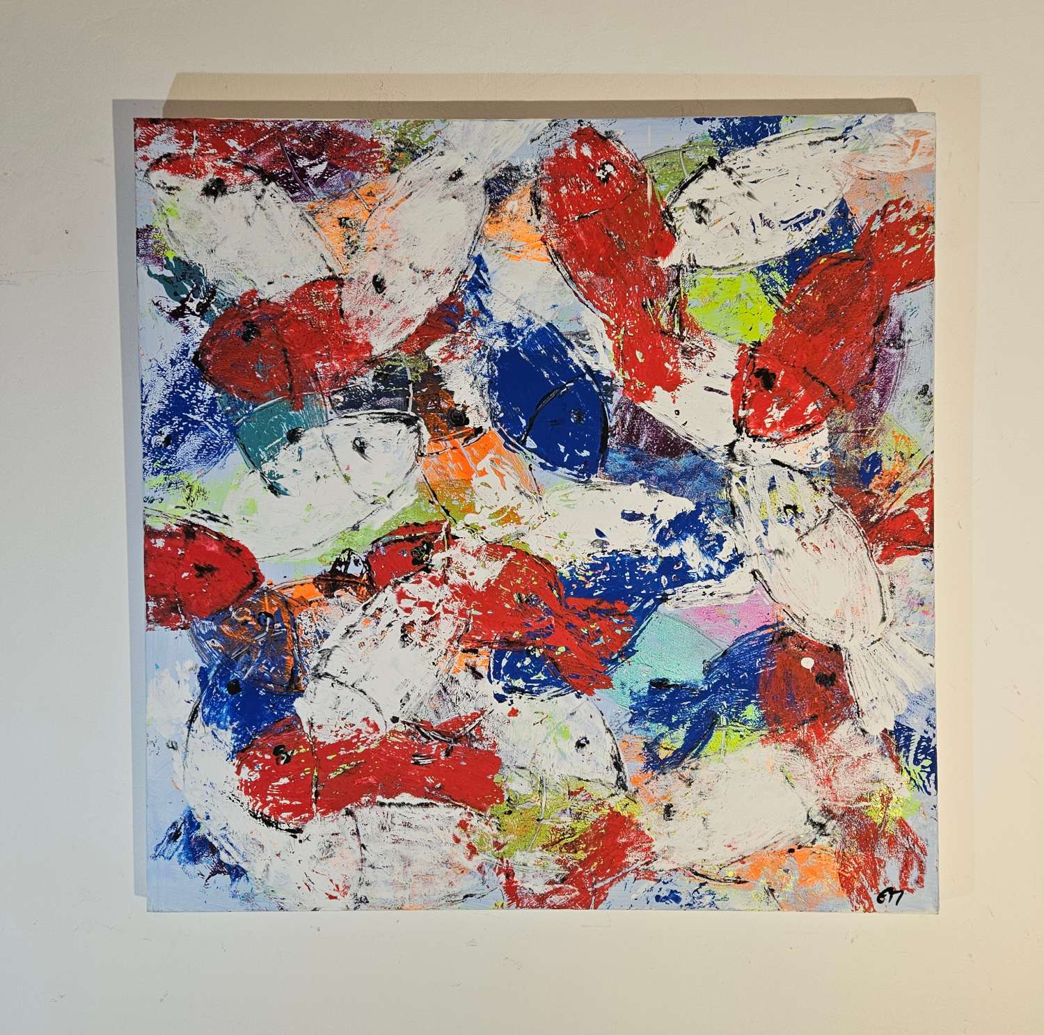 In this artwork, I aimed to capture the effervescence and freedom of fish in the water, blending figurative forms with abstract acrylic touches. The vibrant colors—reds, blues, and whites—create a dynamic dance, bringing a revitalizing energy that brightens any space. It is a celebration of movement and life, designed to fill your interior with vibrant joy and renewed freshness.