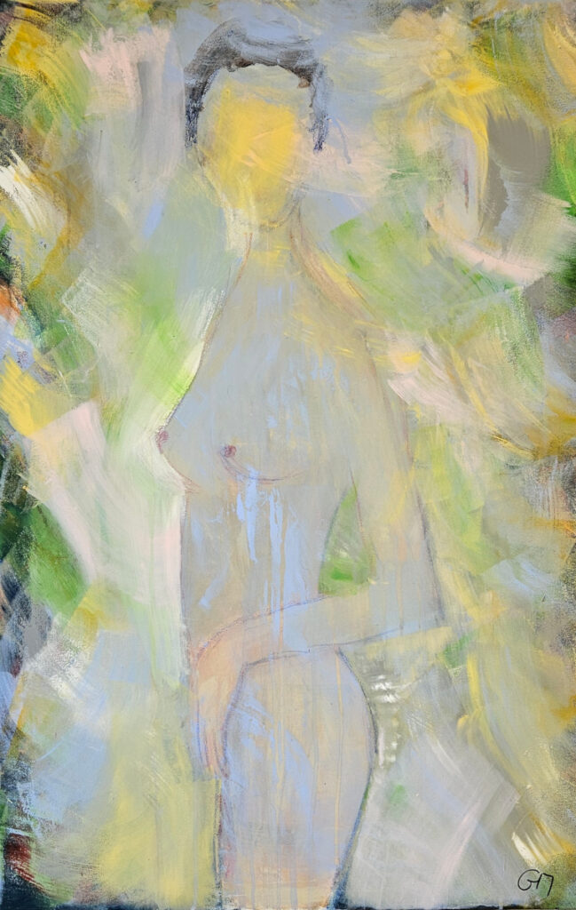 Contemporary multicolored figurative painting by the French artist Guillaume Marchat, depicting a seated woman facing forward in a red dress. The painting is very luminous and harmonious, enhanced by ivory circles that add volume.