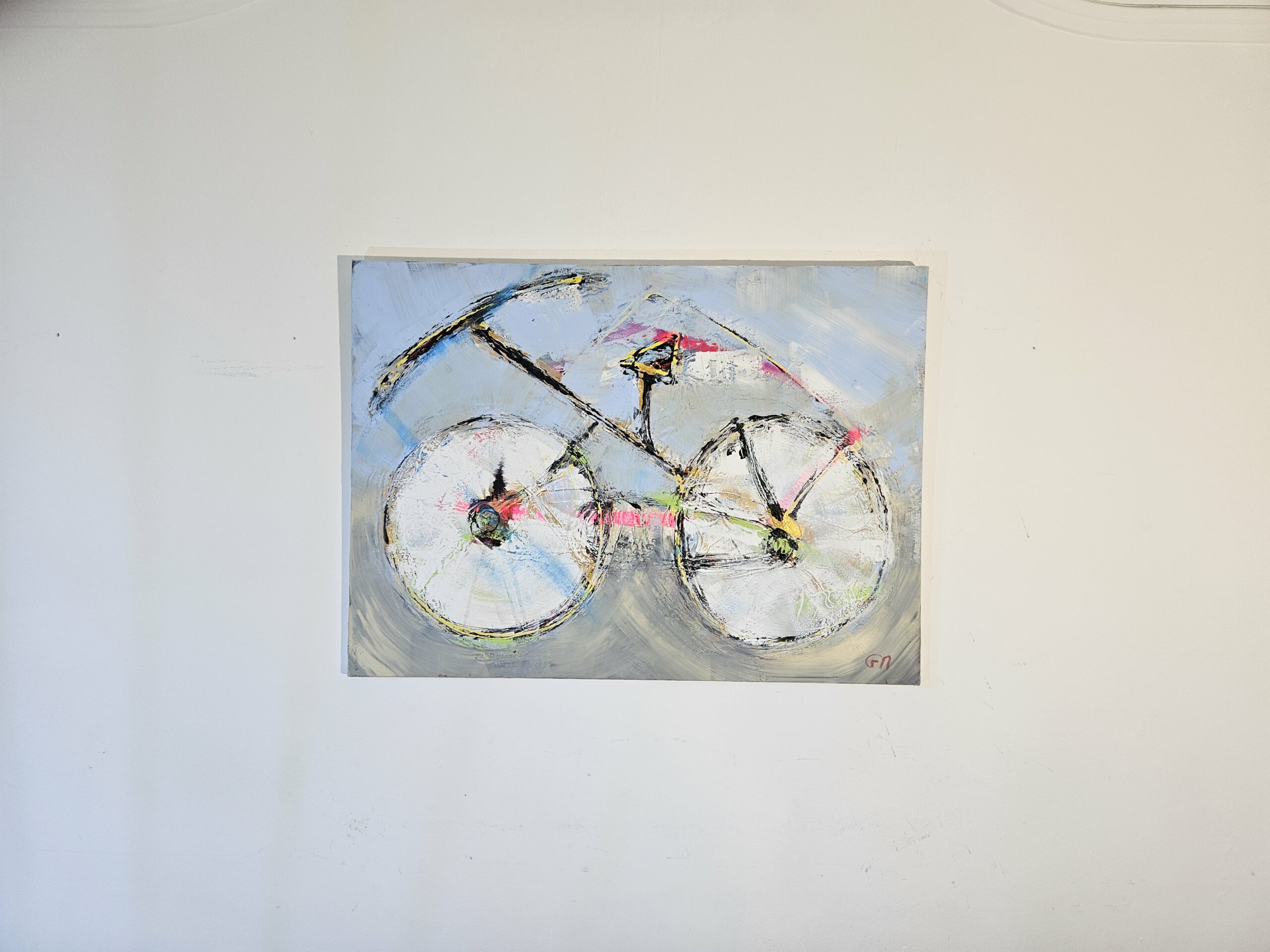 Contemporary and minimalist artwork painted by the French artist Guillaume Marchat, showing a black and pink biccycle on a blue background
