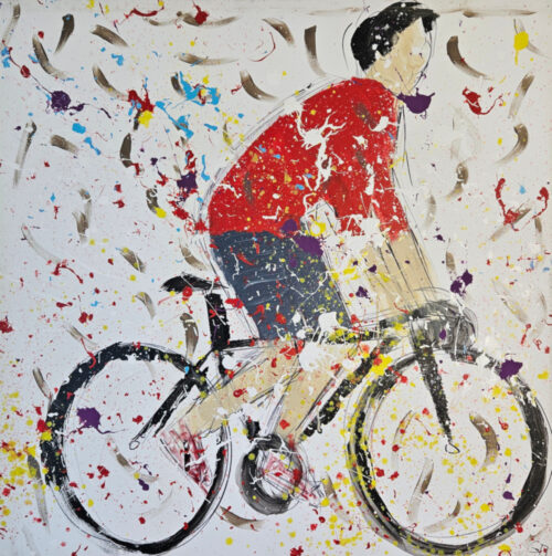 Bicycle, cyclist in a red jersey, modern acrylic painting on canvas, 100×100 cm.