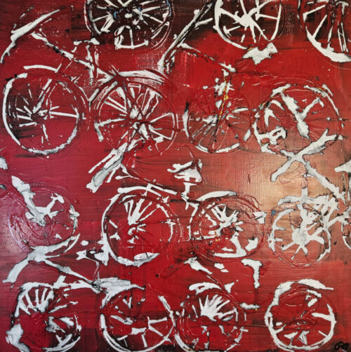 Bicycles, white bicycles on a red background, modern acrylic painting on canvas, 100×100 cm.