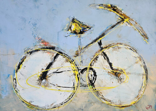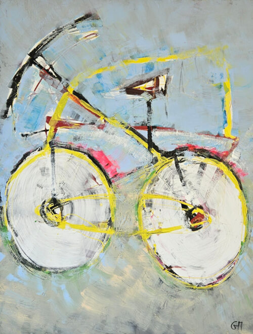 Bicycle, Tour de France cyclist, yellow jersey, acrylic painting on canvas, 100×100 cm