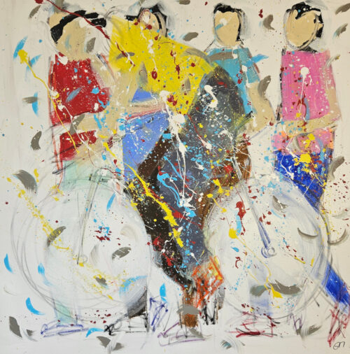 Cyclists, family biking, acrylic painting on canvas, 100×100 cm