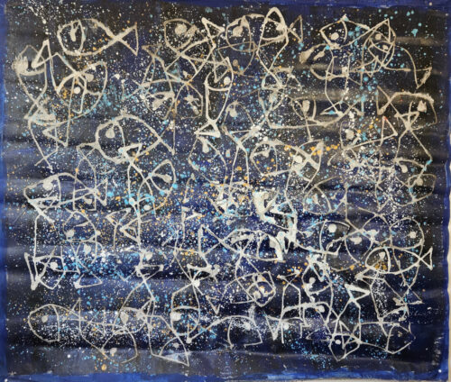 White fish on a blue background, acrylic painting on canvas, 167×189 cm