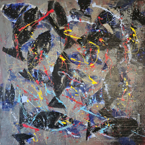 Black fishes, acrylic painting on canvas, 100×100 cm.