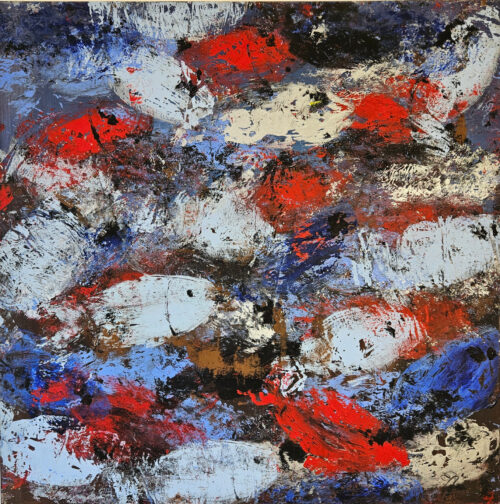 White, red, and blue fish, acrylic painting on a 100×100 cm canvas.