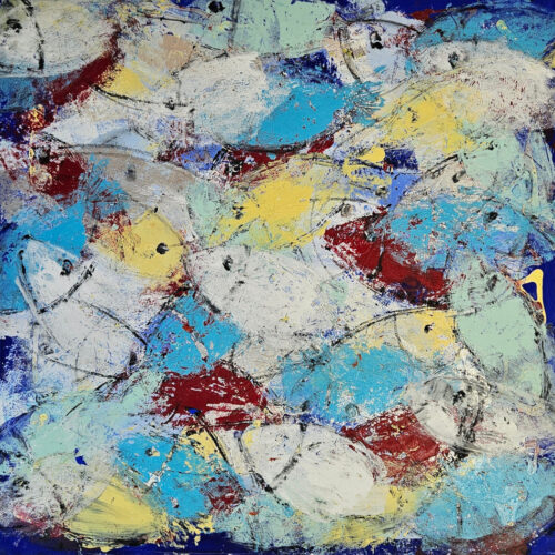 School of yellow and white fish, acrylic on canvas, 80×80 cm.