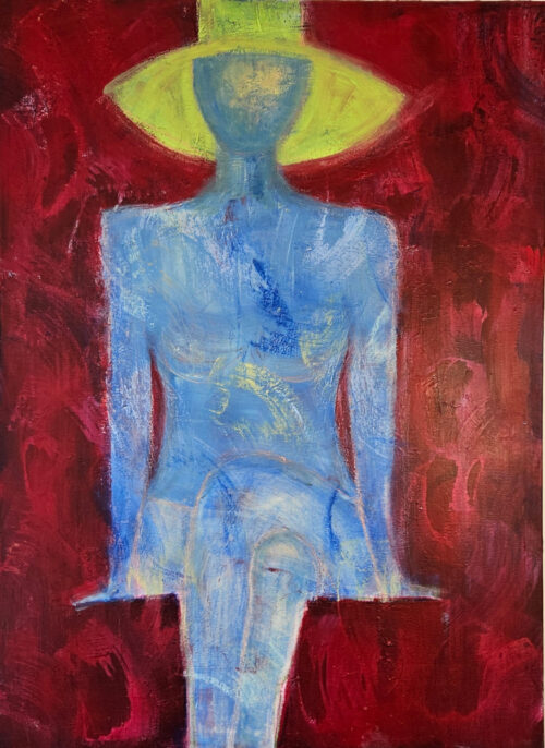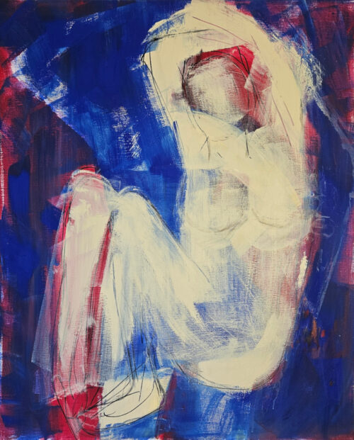 Red nude woman on a blue background, acrylic painting on canvas, 100×81 cm.