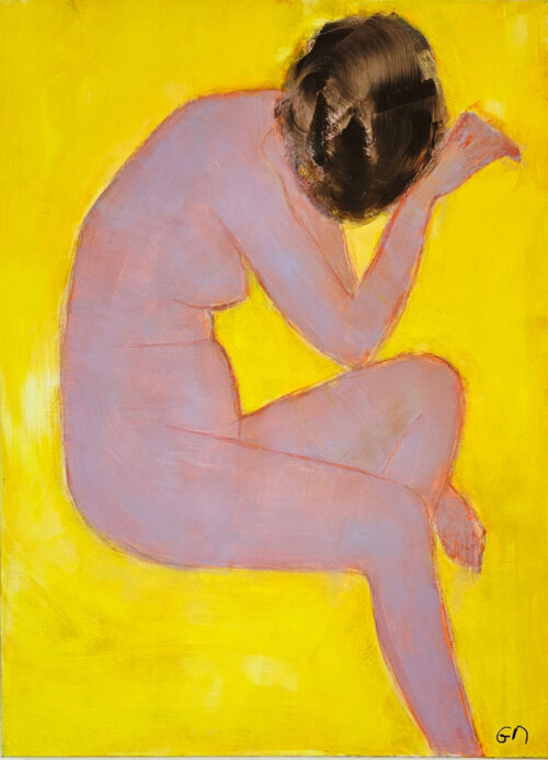 Pink nude woman on a yellow background, acrylic painting on canvas, 100×73 cm.